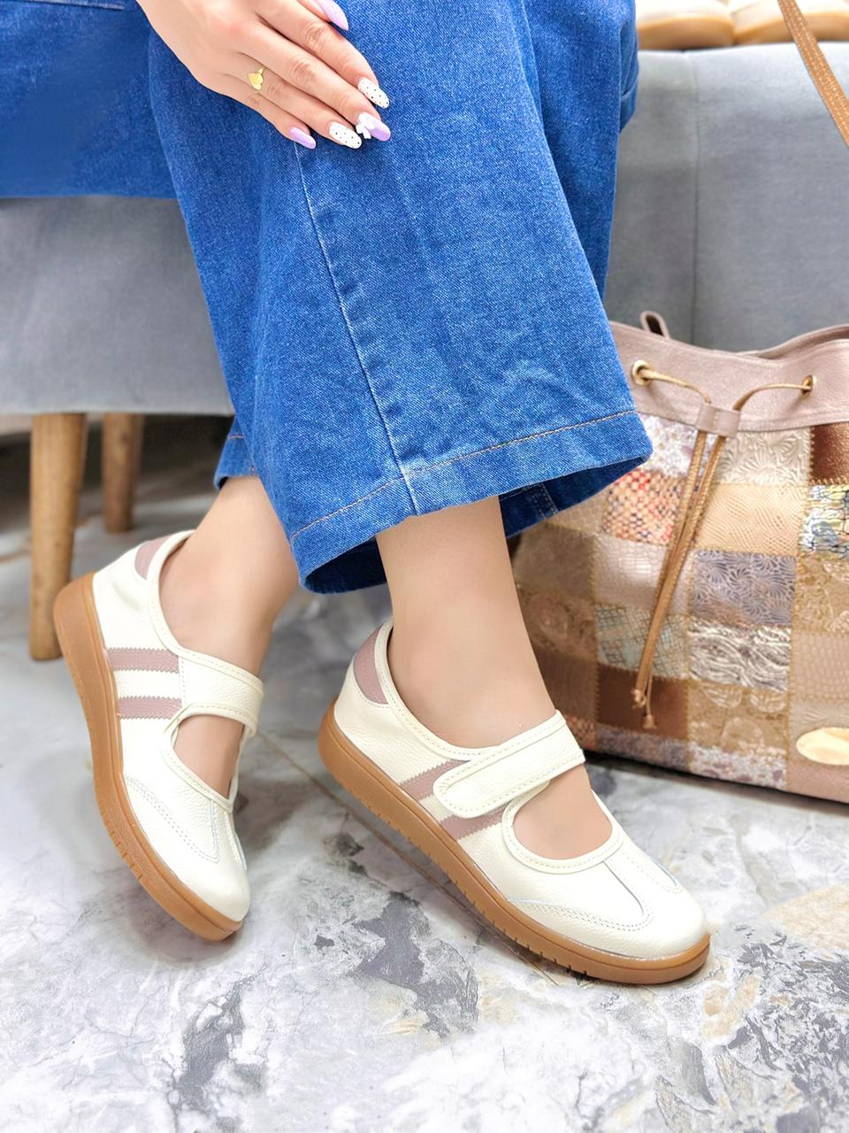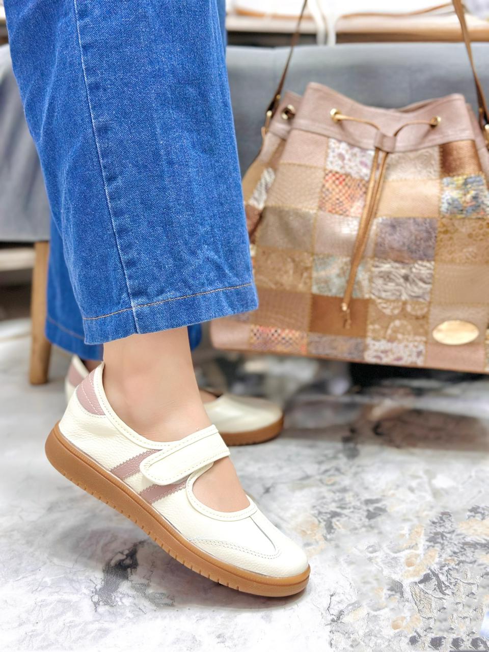 Zapatos de cuero Talco combinado con taupe diseño clásico tipo Mary Jane, ideales para el uso diario. Están confeccionados en cuero de alta calidad, suave y resistente, que brinda comodidad y durabilidad. Cuentan con una correa con cierre ajustable que asegura un buen calce y mayor estabilidad al caminar. La suela color caramelo es flexible y antideslizante, perfecta para acompañarte durante todo el día. Su diseño versátil los hace ideales tanto para looks casuales como más formales.