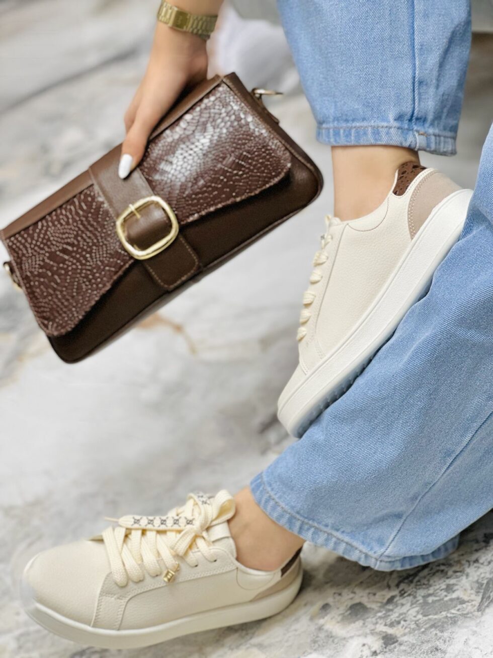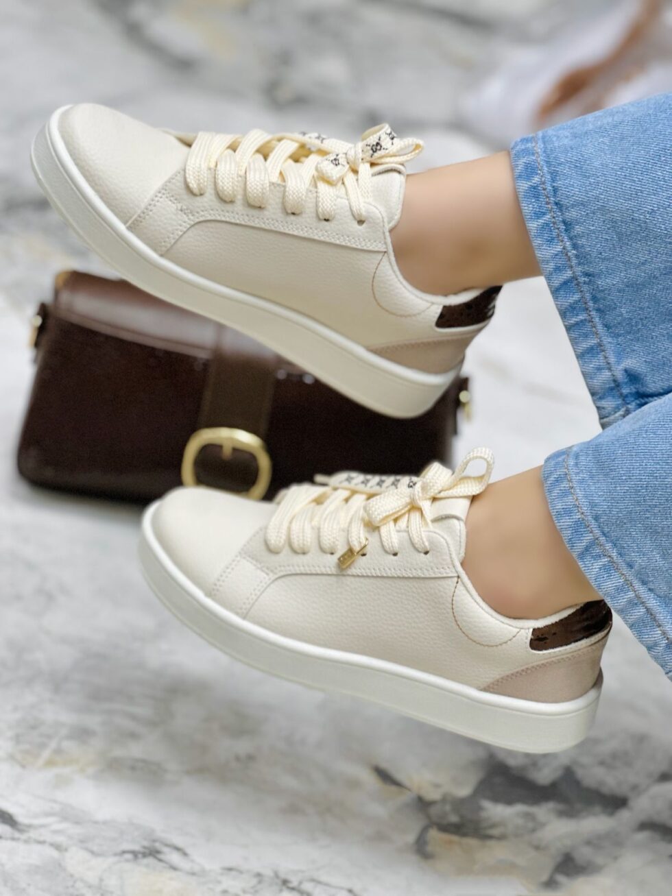 Tenis en material sintético de la mejor calidad, en color beige con un elegante detalle trasero en tono chocolate. Su diseño de suela baja y plantilla confort los convierte en el calzado ideal para combinar con cualquier outfit y lucir perfecto en toda ocasión.
