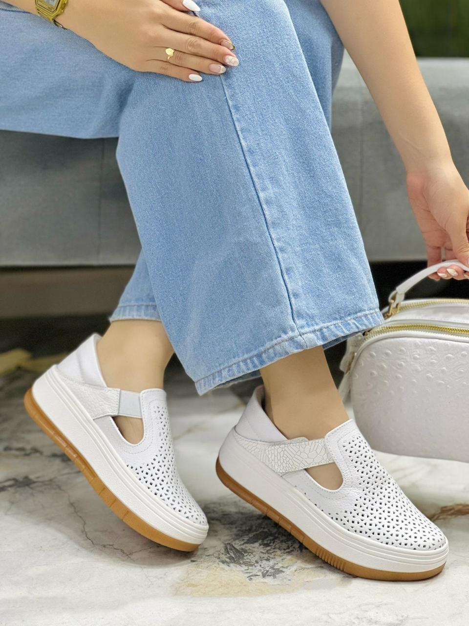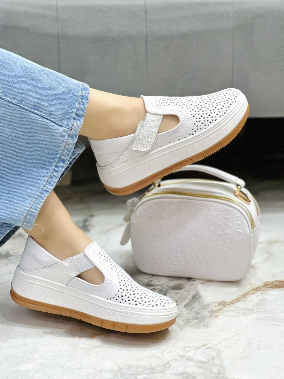 Estos tenis en cuero color blanco combinan estilo, comodidad y practicidad en un solo diseño. Su estructura sin cordones y el práctico cierre en velcro los hacen ideales para una postura fácil y rápida, perfectos para el día a día. La capellada cuenta con un delicado diseño troquelado que aporta frescura y un toque moderno, mientras que su suela tipo plataforma en tono caramelo brinda estabilidad y un andar suave. Una opción versátil, ligera y muy cómoda para cualquier ocasión.