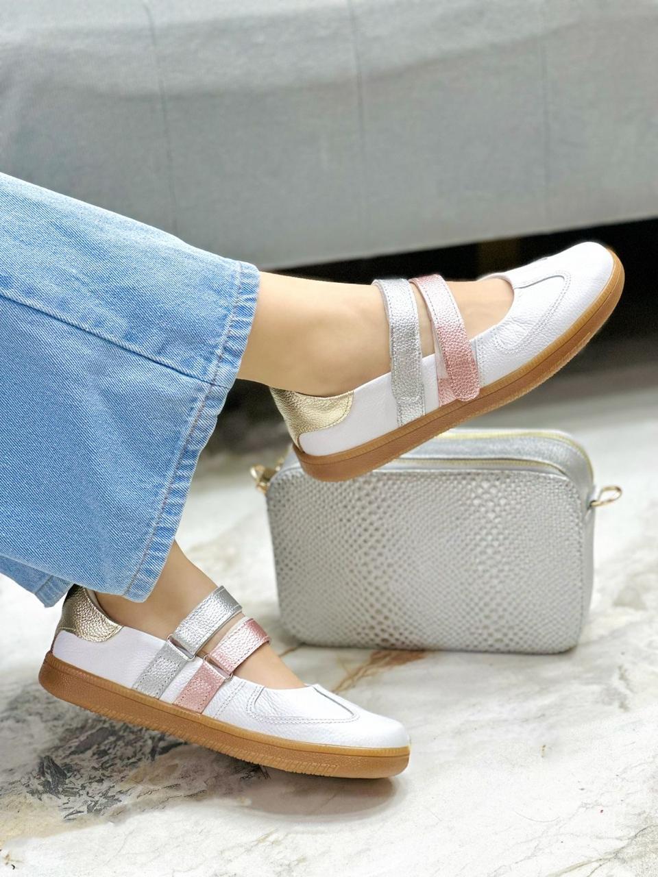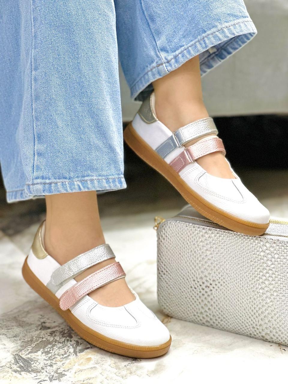 Su diseño sin cordones, con doble correa en velcro, garantiza una postura práctica y un ajuste cómodo. Las correas combinan tonos metalizados en plateado y rosado, aportando un toque sutil de brillo y elegancia. El talón en acabado dorado complementa el diseño y eleva su estilo.