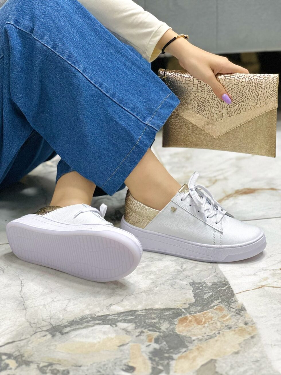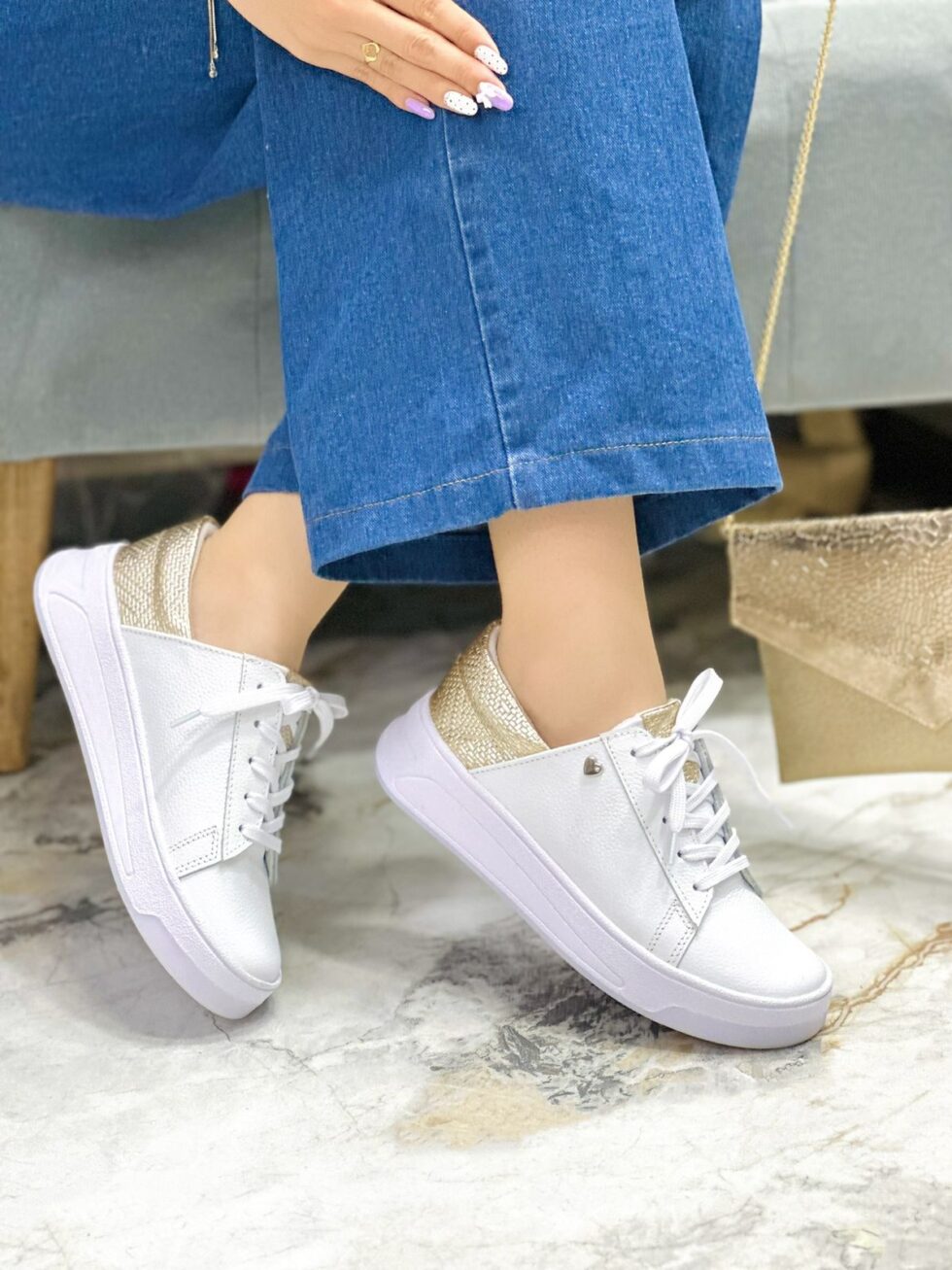 Estos tenis clásicos en color Blanco combinado con cuero de color dorado en la parte de atrás. Con un diseño atemporal y elegante, se adaptan fácilmente a tu estilo diario. Su suela proporciona una gran durabilidad y tracción, mientras que el interior cuenta con un suave acolchonado en sintético, que garantiza una comodidad excepcional durante todo el día. Ideales para el día a día, estos tenis ofrecen el equilibrio perfecto entre confort y versatilidad, convirtiéndolos en un imprescindible para tu guardarropa.