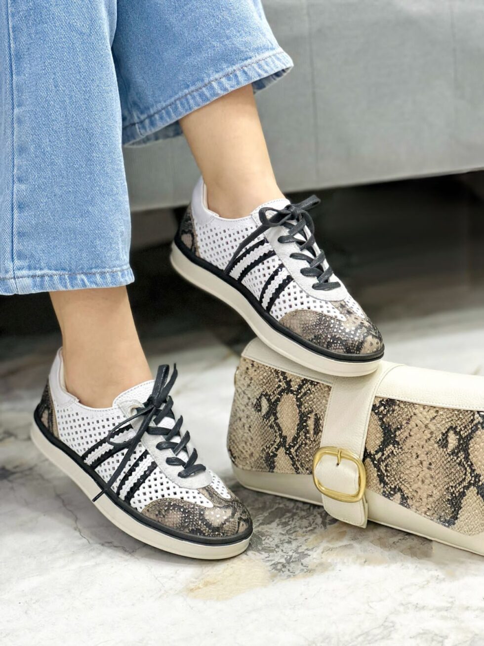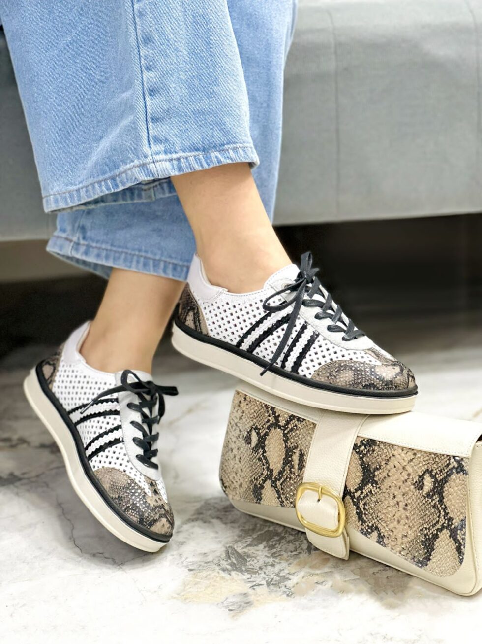 Estos tenis en cuero color talco destacan por su combinación única de piezas en print miel y detalles en carnaza que les dan un toque moderno y sofisticado. A los laterales cuentan con líneas decorativas que complementan el diseño y aportan un contraste elegante.