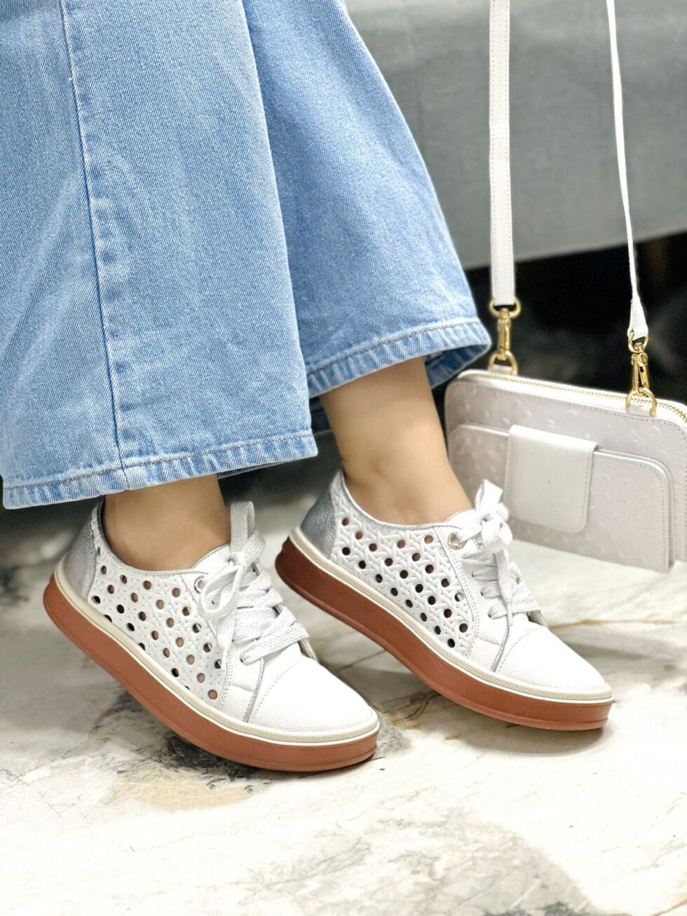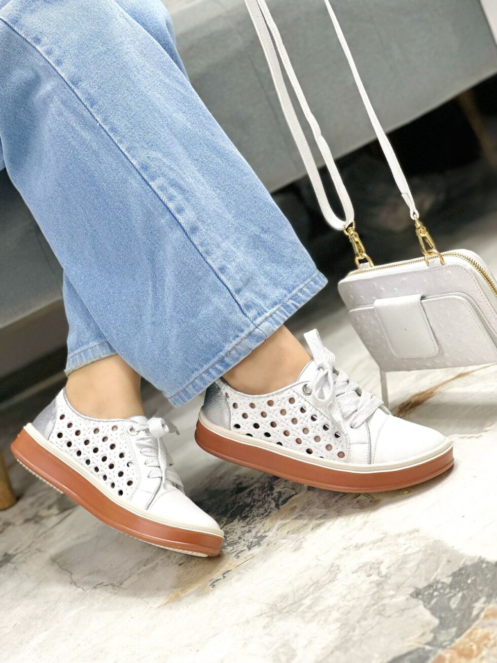 Los tenis en color blanco con detalle plateado en la parte trasera combinan estilo moderno y practicidad. Su diseño en cuero perforado aporta frescura y un look versátil, mientras que el abullonado en material sintético brinda suavidad y soporte extra. Además, cuentan con plantilla confort que garantiza bienestar durante todo el día. Su suela baja los convierte en la opción ideal para uso diario, ofreciendo comodidad y un toque de elegancia casual en cada paso.