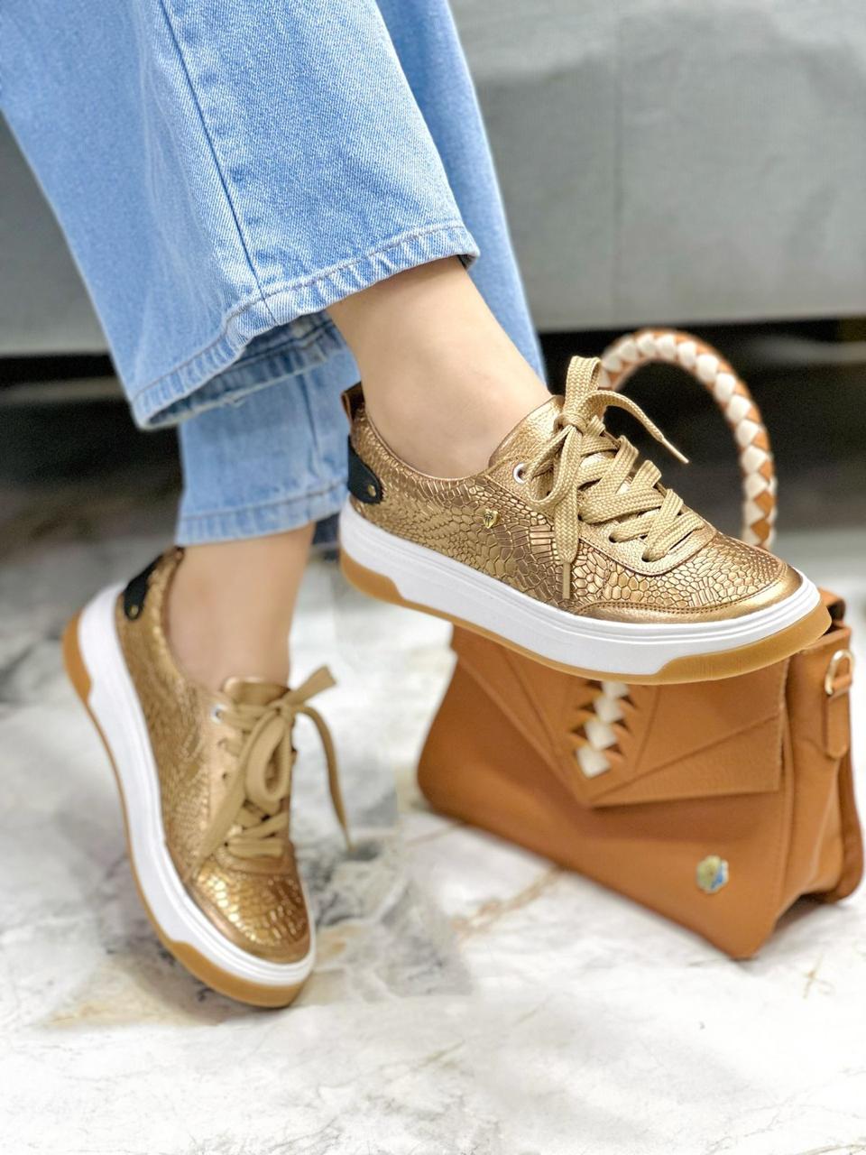 Tenis Bronce fabricados en cuero de alta calidad con una folia que resalta su diseño elegante y moderno, además cuenta con un toque en color negro en la parte de atrás. El interior está compuesto por un abullonado sintético que garantiza una comodidad superior, proporcionando un ajuste perfecto para el pie durante todo el día. Ideal para quienes buscan un calzado que combine estilo, durabilidad y confort en cada paso, perfecto para cualquier ocasión.”