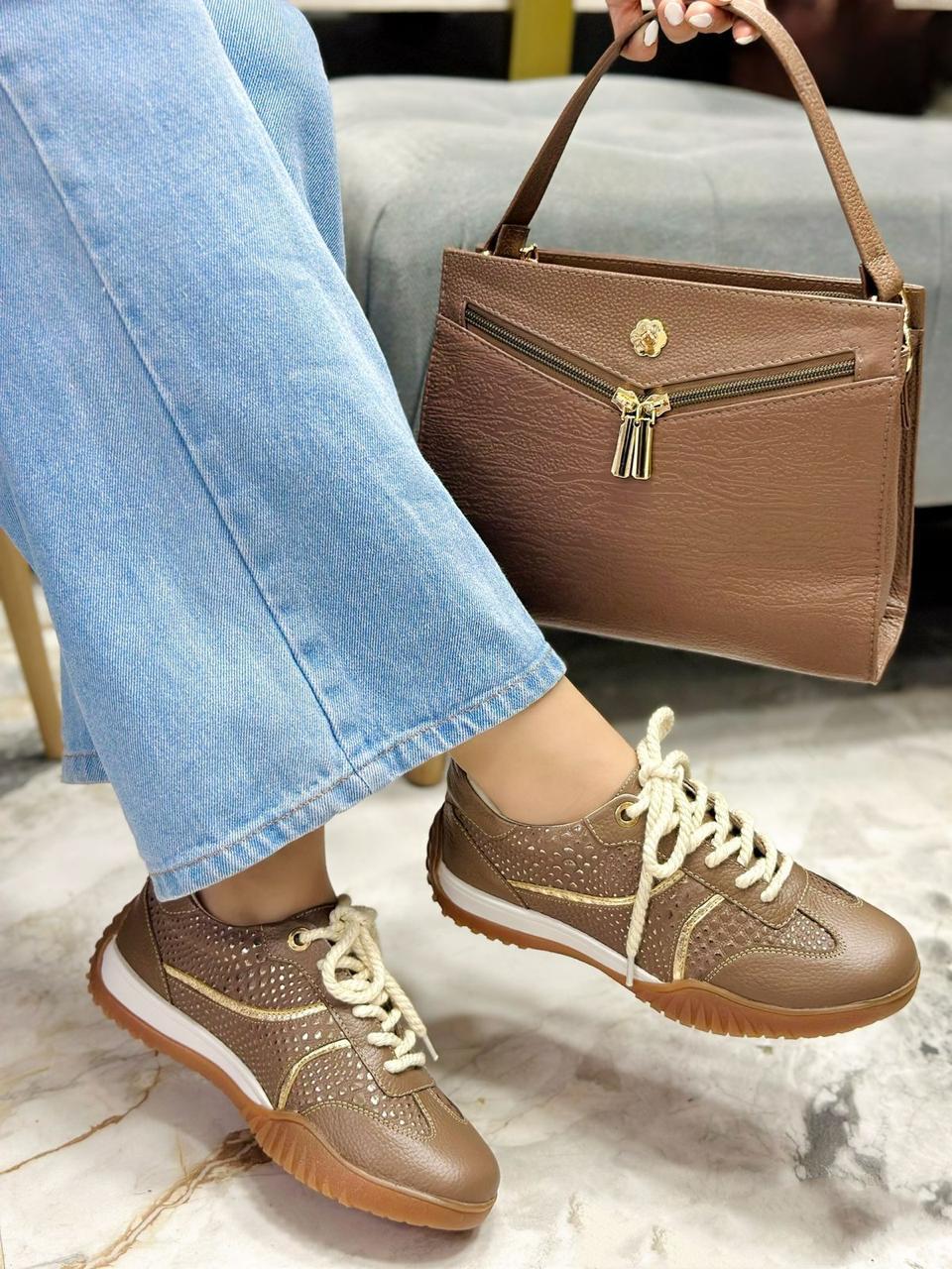 Tenis en cuero color Brownie con finos detalles dorados que aportan un toque elegante y moderno. Diseñados para brindar comodidad durante todo el día, cuentan con un acabado de alta calidad, ajuste perfecto y una suela resistente ideal para el uso diario. Su diseño versátil los hace perfectos para combinar con looks casuales o más sofisticados, ofreciendo estilo, confort y durabilidad en cada paso.