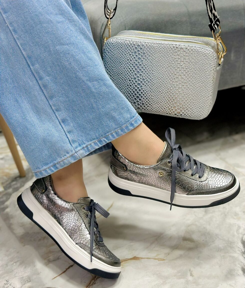 Tenis en color Caño Fusil fabricados en cuero de alta calidad con una folia que resalta su diseño elegante y moderno. El interior está compuesto por un abullonado sintético que garantiza una comodidad superior, proporcionando un ajuste perfecto para el pie durante todo el día. Ideal para quienes buscan un calzado que combine estilo, durabilidad y confort en cada paso, perfecto para cualquier ocasión.”