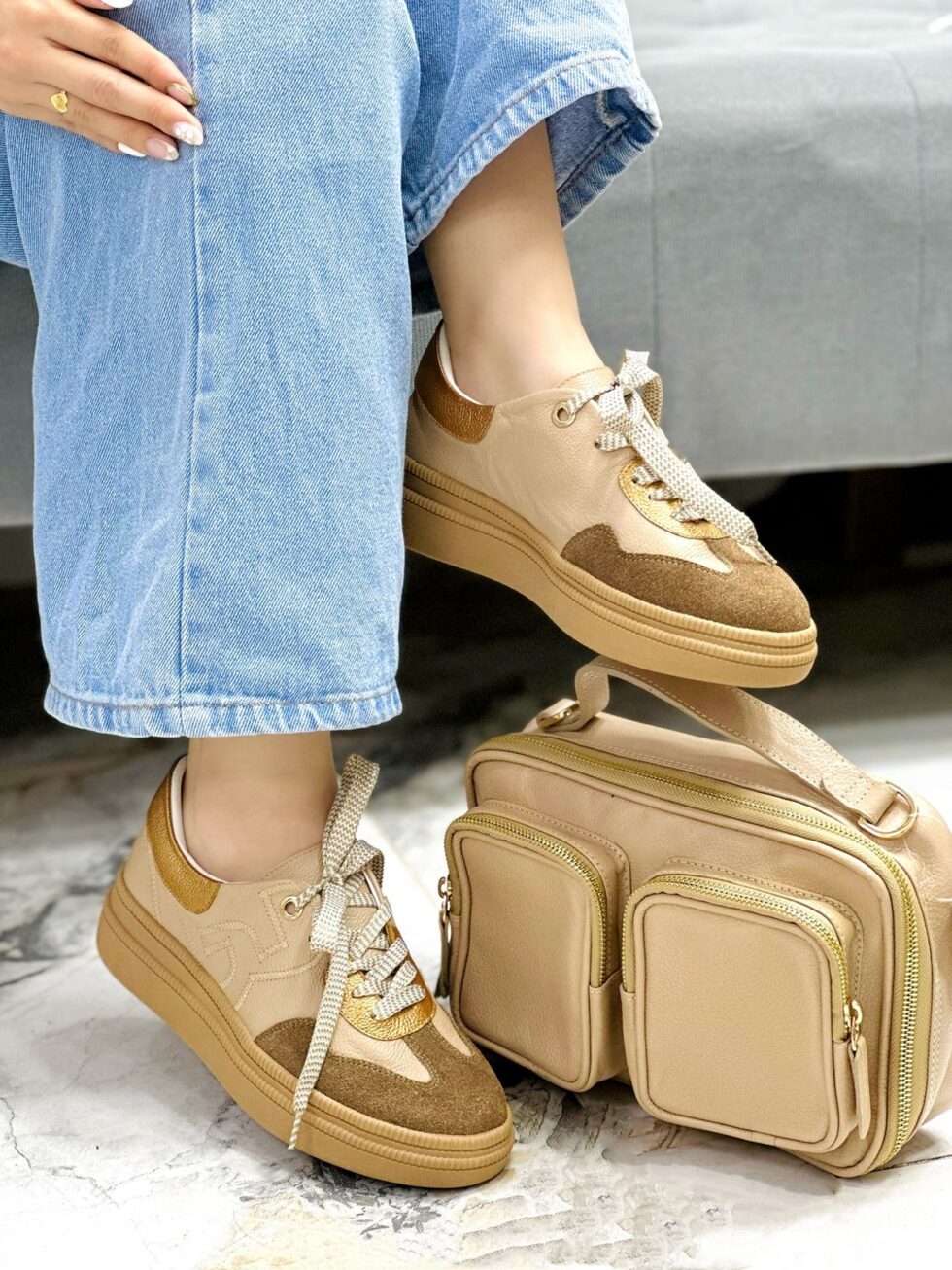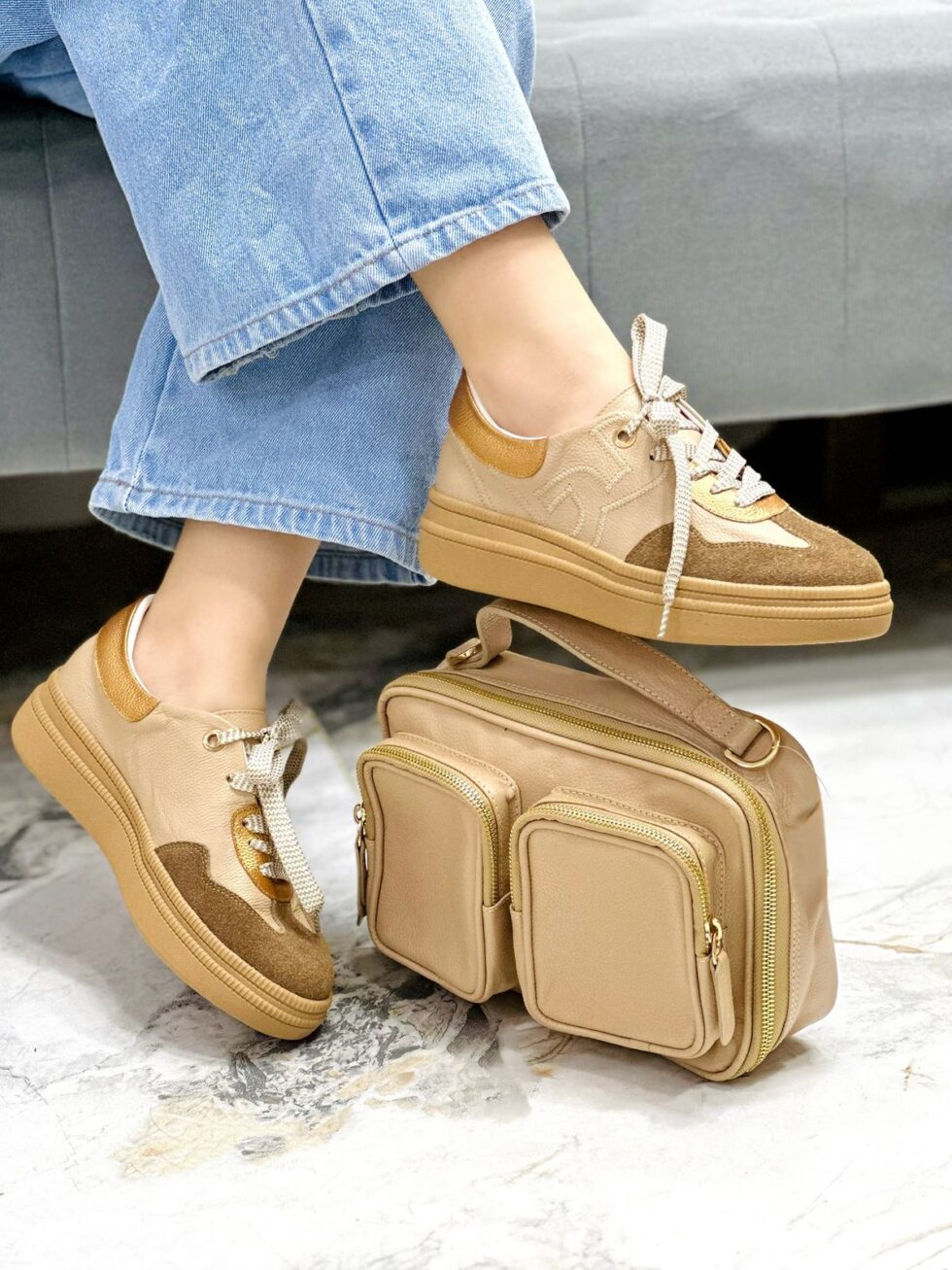 Tenis 100% en cuero en un elegante tono Capuchino, combinados con piezas en color carnaza y toques dorados que realzan su diseño. Incluyen un bordado lateral que forma una figura sutil y moderna. Su interior cuenta con abullonado en forro textil para mayor comodidad y una suela caramelo que aporta estilo y ligereza.