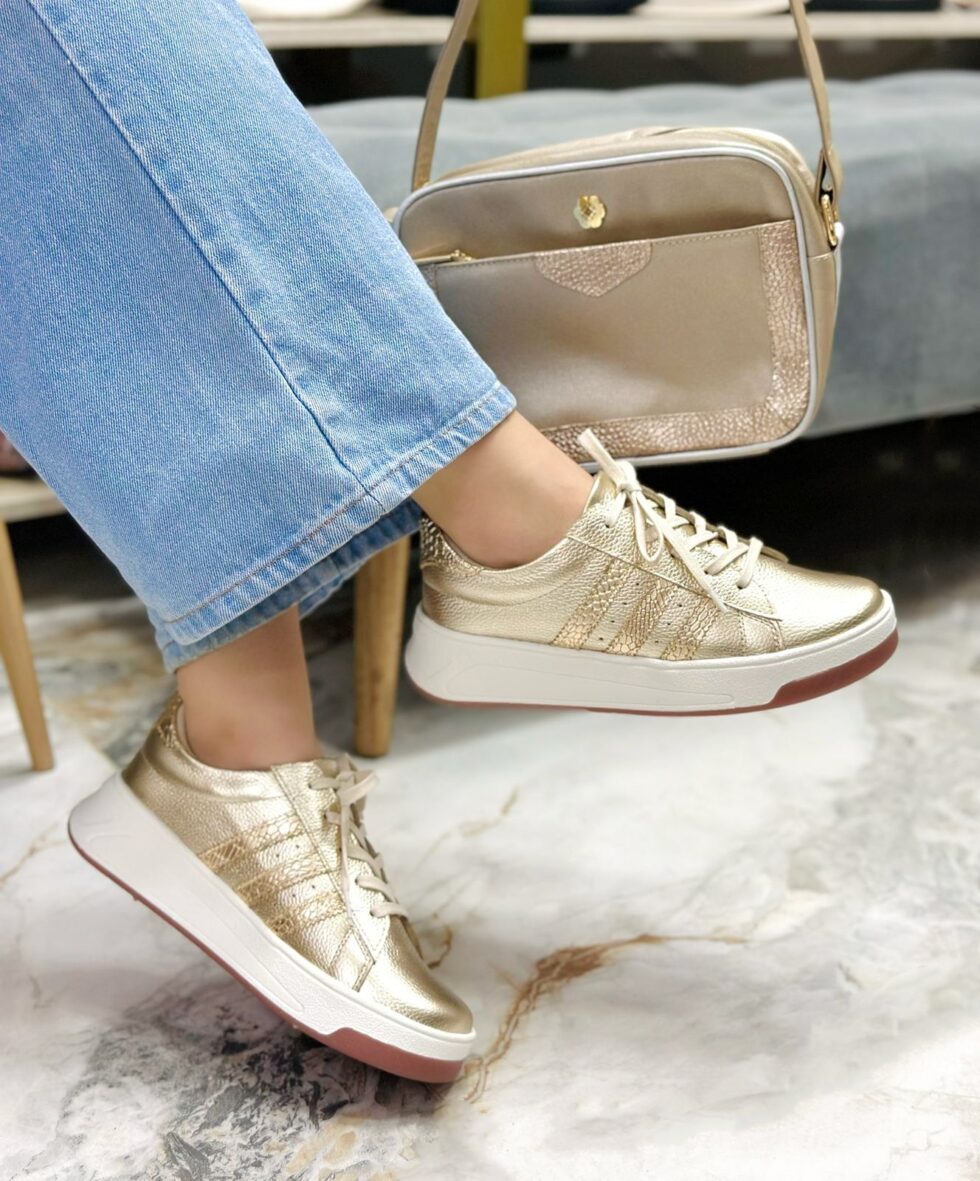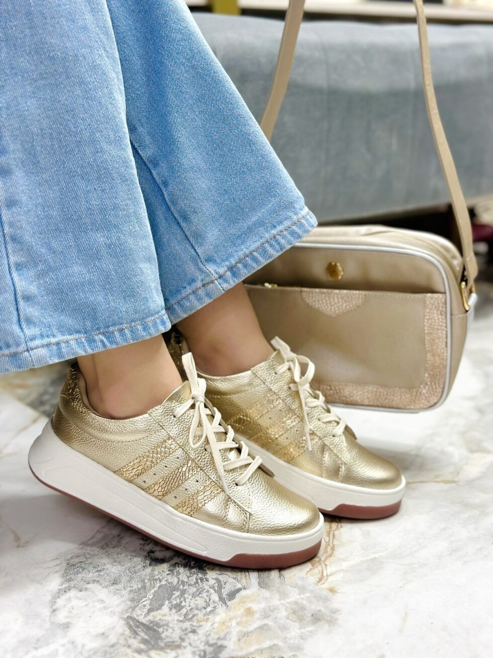 Los tenis en color Dorado combinados con líneas en el mismo tono a los lados son la mezcla perfecta entre estilo urbano y versatilidad. Su diseño moderno en cuero aporta resistencia y personalidad, mientras que su suela cómoda y ligera asegura confort durante todo el día. Ideales para darle un toque audaz a tus looks diarios, estos tenis son la elección perfecta para quienes buscan destacar con autenticidad y estilo.