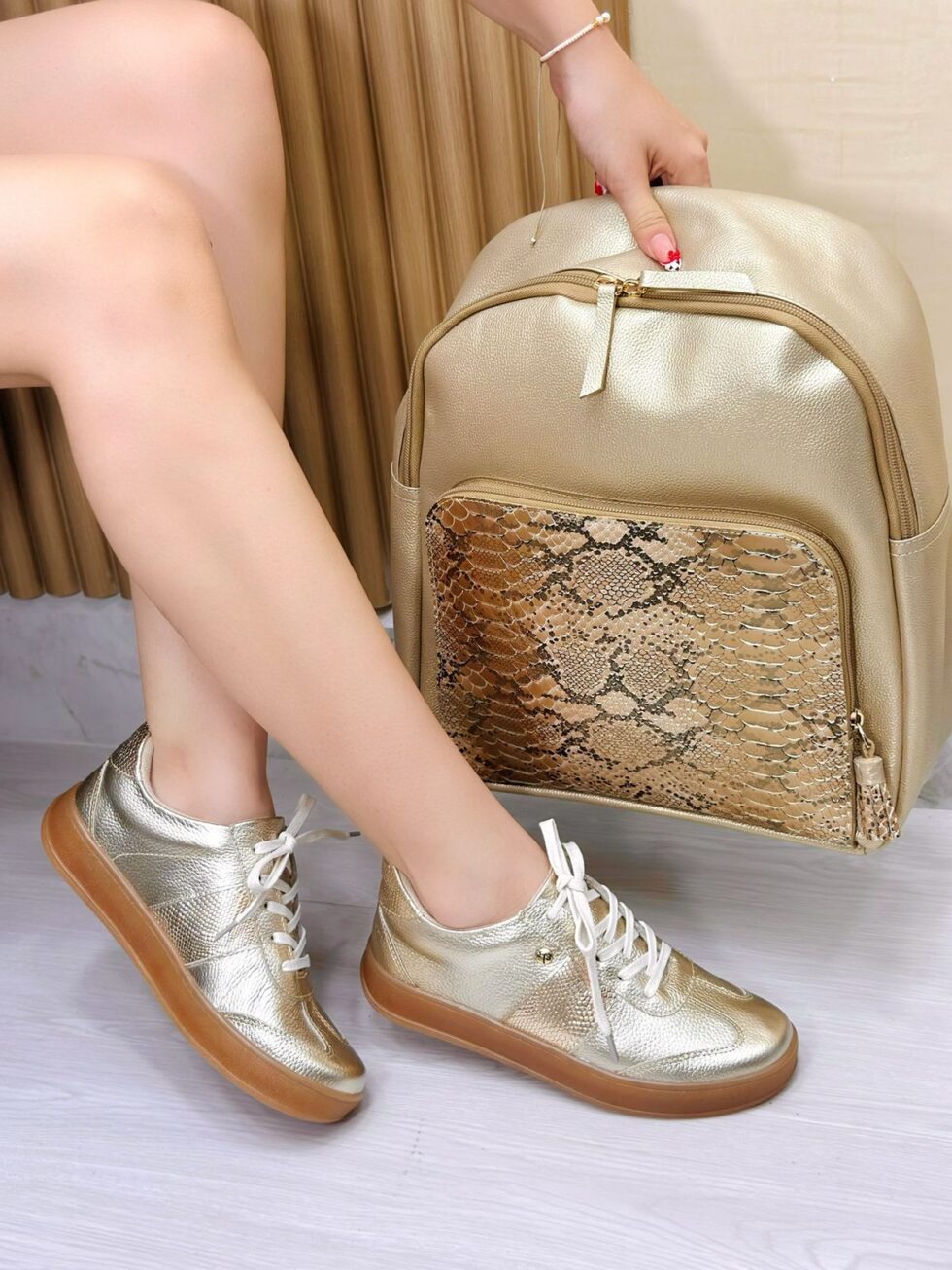 Tenis en cuero diseñados para quienes buscan comodidad sin perder elegancia. Su acabado en color Dorado los convierte en un básico versátil que combina fácilmente con cualquier outfit, mientras que los detalles en textura aportan un toque sofisticado y diferente.
