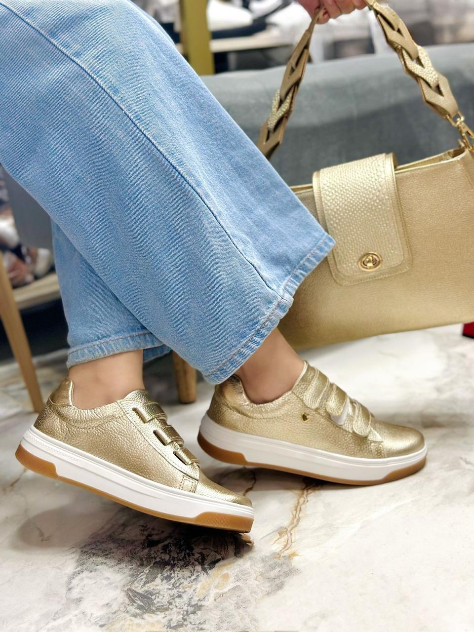 Los tenis combinan practicidad y estilo en un diseño moderno y versátil. Fabricados 100% en cuero, ofrecen durabilidad y un acabado sofisticado. Su sistema de cierre en velcro permite una postura fácil y rápida, brindando comodidad en cada uso. En color Dorado , se convierten en un básico infaltable que complementa cualquier look con un toque limpio y elegante.
