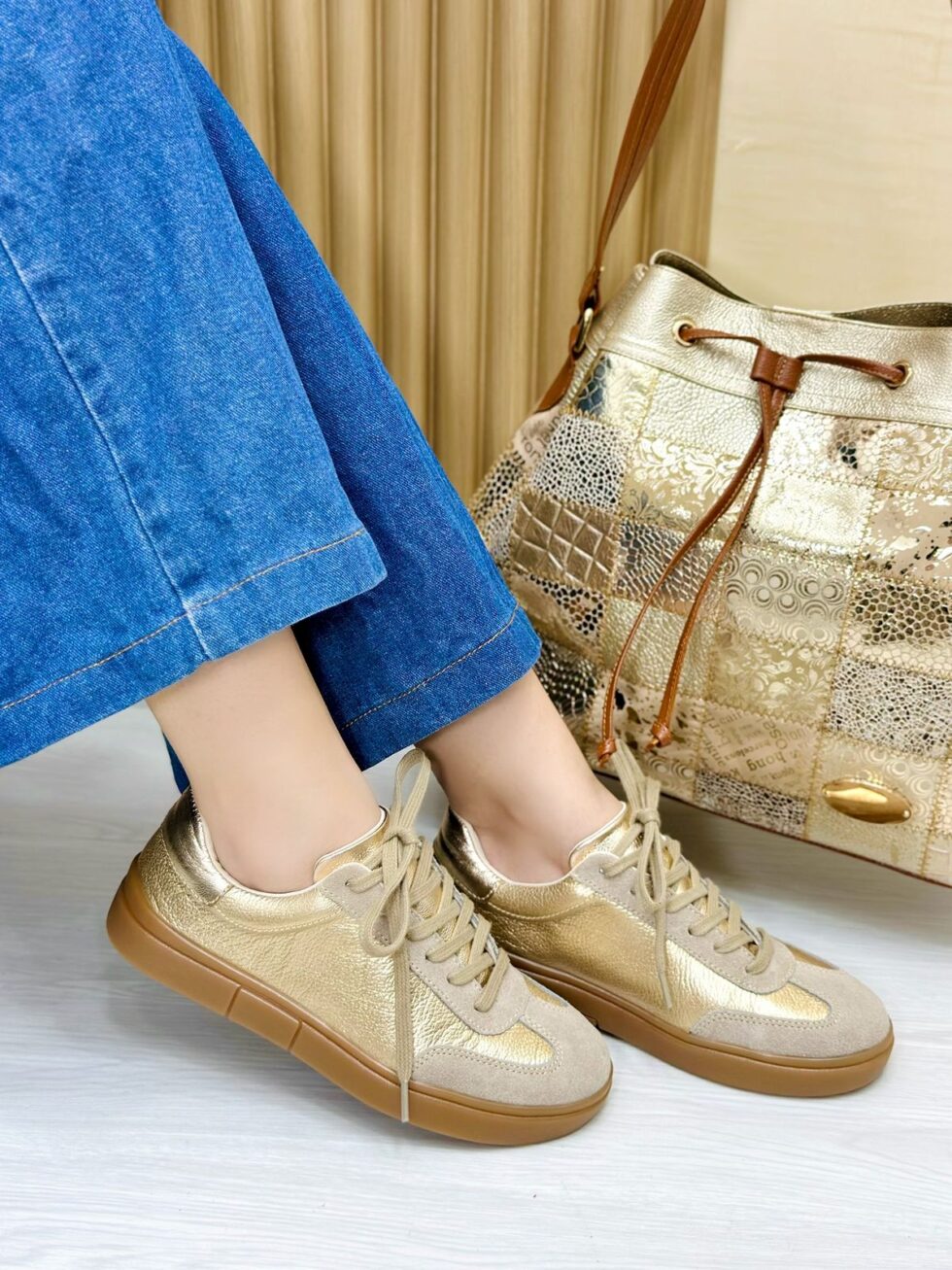 Los tenis son la combinación perfecta de estilo casual y elegancia sutil. Elaborados en cuero Dorado en un sofisticado tono arena, ofrecen una textura suave y un acabado natural que aporta frescura y versatilidad a cualquier look.