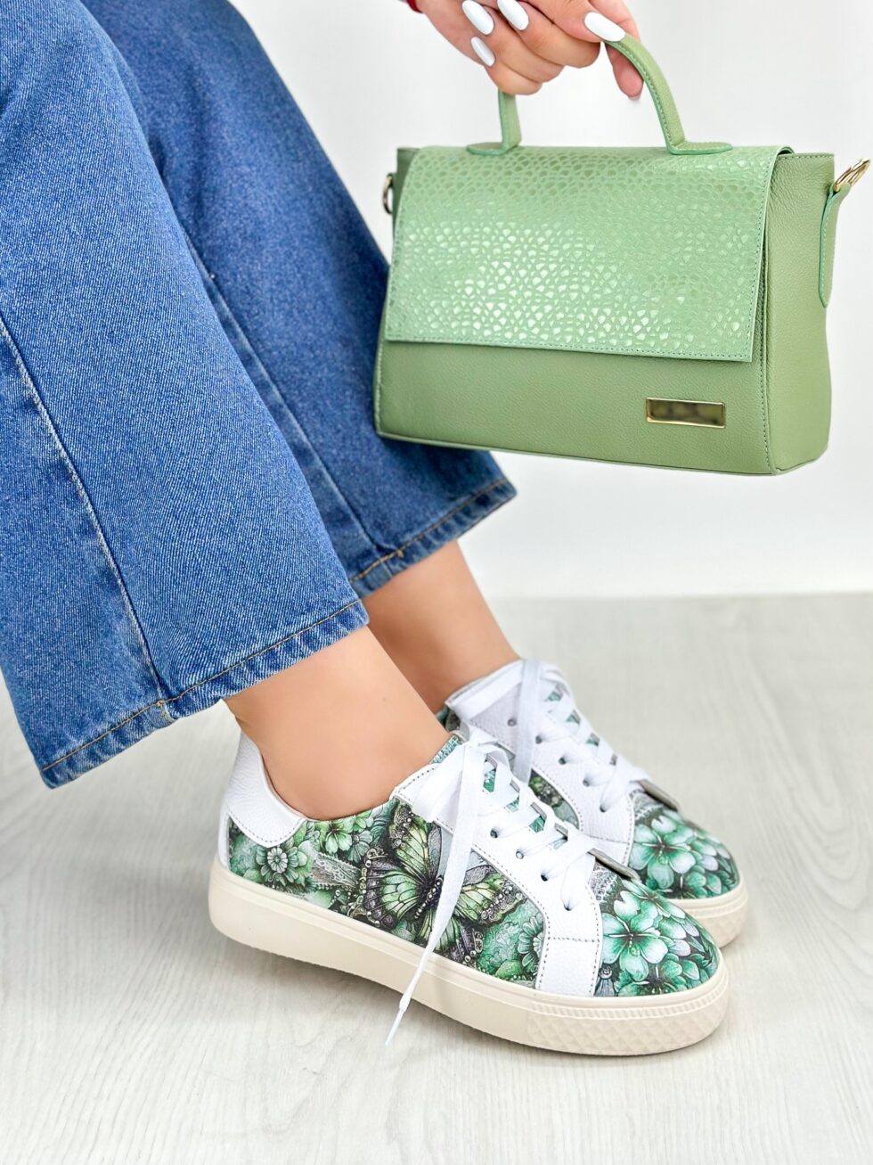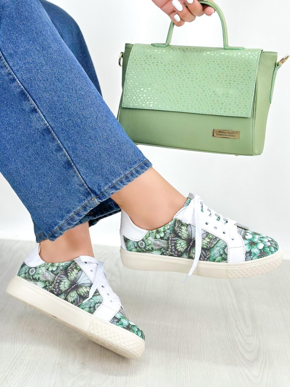 Estos tenis en color Blanco destacan por su elegante diseño estampado con mariposas y flores en tonos Verde, que aporta un toque femenino y original. Fabricados en cuero de alta calidad, cuentan con un interior abullonado en material sintético que brinda una comodidad excepcional en cada paso. Su armoniosa combinación de colores entre los tonos Verde y el café de la Talco