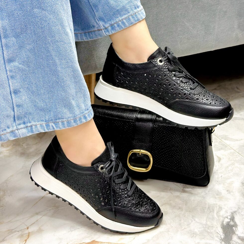 Tenis en cuero color negro con diseño troquelado que aporta un toque elegante y moderno. Su suela blanca crea un contraste sofisticado, mientras que su interior cuenta con abullonado para mayor comodidad. Perfectos para quienes buscan estilo y confort en un solo calzado.