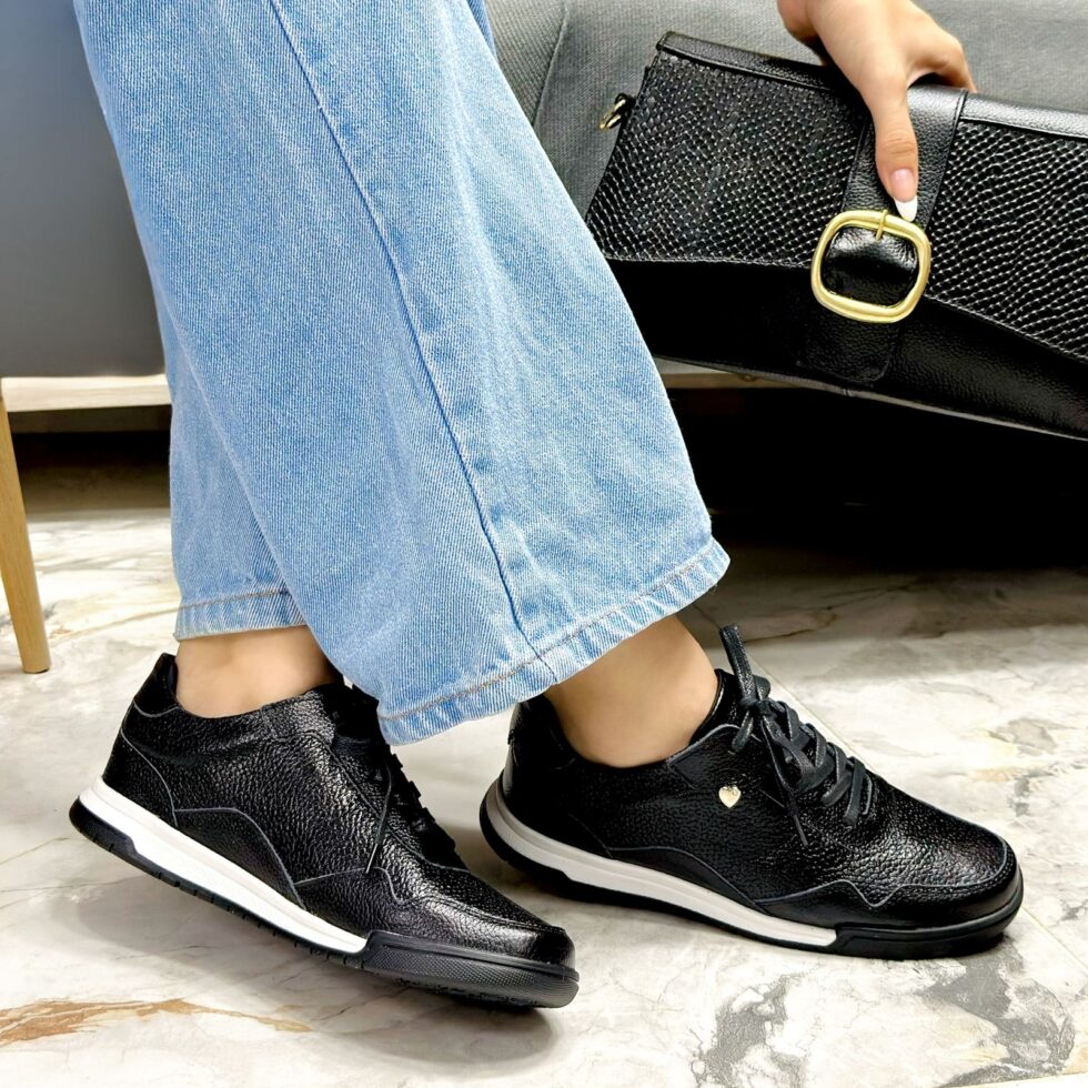 Estos tenis en cuero color Negro combinan elegancia, comodidad y estilo en un solo diseño. Su suela bajita en tono talco con detalle negro aporta un toque moderno y versátil, perfecto para usar todos los días. Fabricados 100% en cuero, cuentan con un forro interno en badana que brinda suavidad, frescura y confort en cada paso. Su tono en tendencia los convierte en un básico imprescindible que combina fácilmente con cualquier outfit, desde jeans hasta looks más casuales. Ideales para mujeres que buscan calidad, estilo y comodidad en un solo calzado