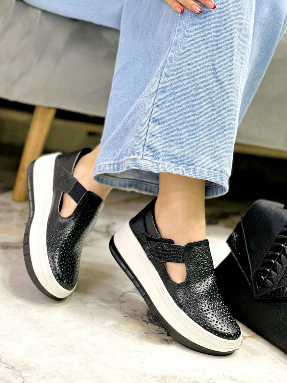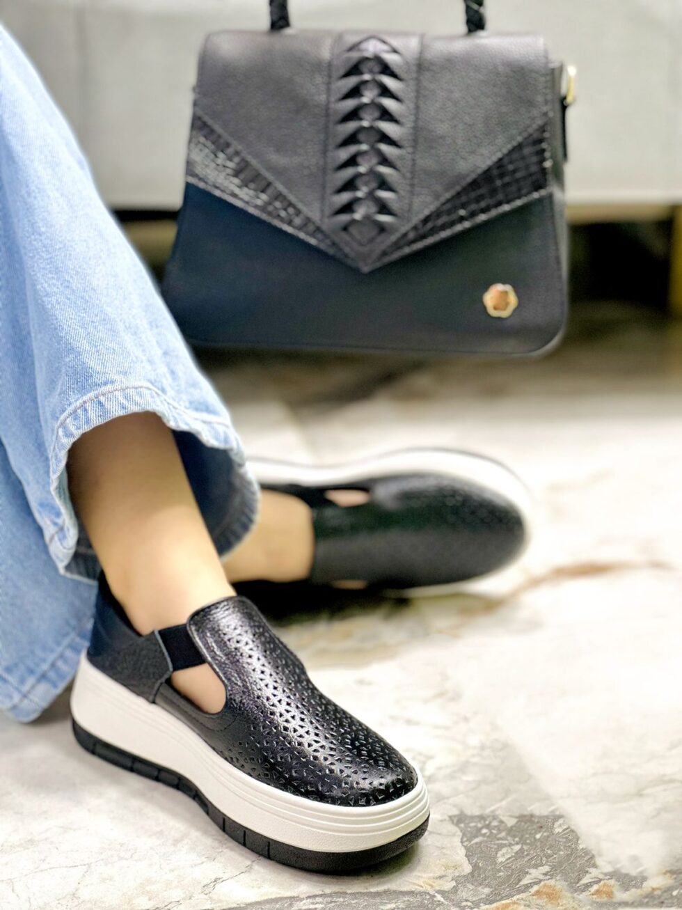 Estos tenis en cuero color Negro combinan estilo, comodidad y practicidad en un solo diseño. Su estructura sin cordones y el práctico cierre en velcro los hacen ideales para una postura fácil y rápida, perfectos para el día a día. La capellada cuenta con un delicado diseño troquelado que aporta frescura y un toque moderno, mientras que su suela tipo plataforma en tono caramelo brinda estabilidad y un andar suave. Una opción versátil, ligera y muy cómoda para cualquier ocasión.