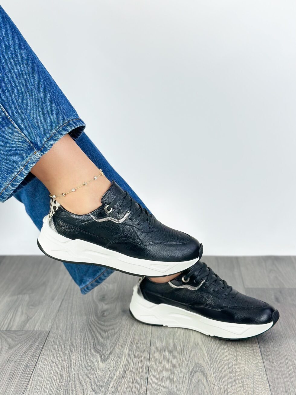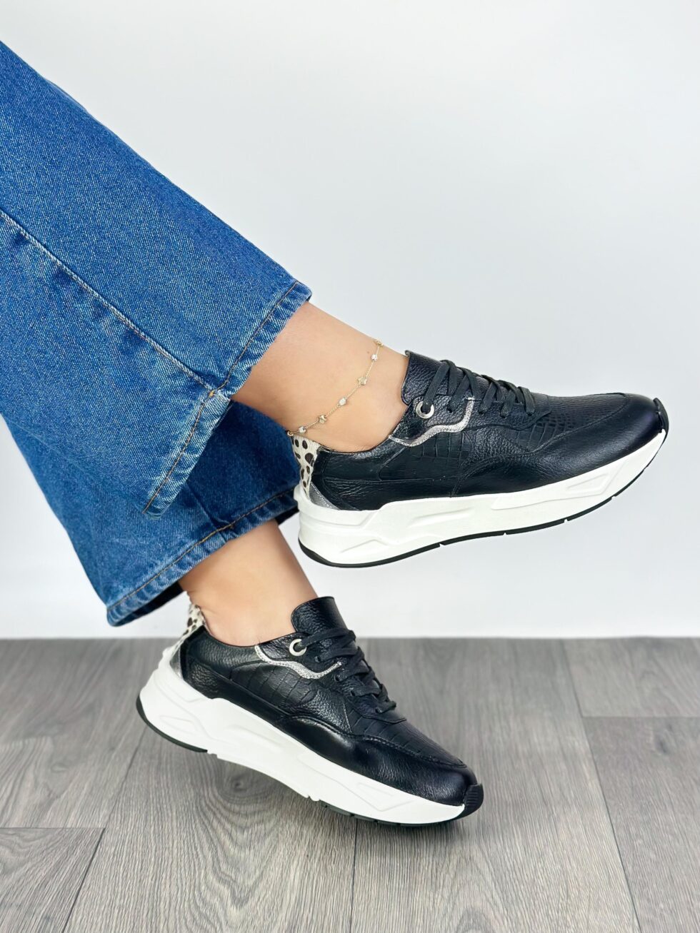 Descubre nuestros tenis en cuero color Negro, con un toque en en caño fusil a los lados que resalta su diseño moderno y versátil. Son perfectos para cualquier ocasión, ya que combinan estilo y comodidad. Su interior está forrado con un abullonado en material sintético que brinda una sensación suave y confortable durante todo el día