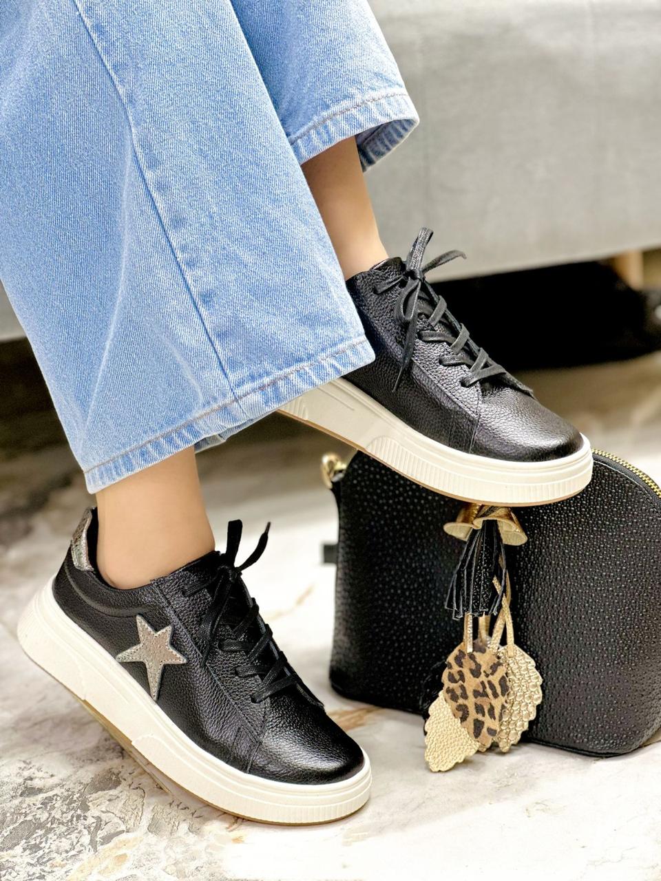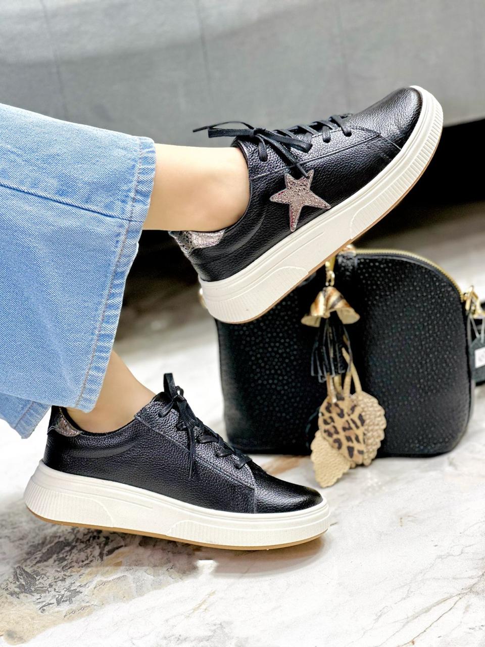 Estos tenis en cuero color Negro son el equilibrio perfecto entre estilo y comodidad. Su diseño se realza con elegantes detalles en color plomo, que aportan un toque moderno y sofisticado, ideal para elevar cualquier outfit casual. Cuentan con una suela talco que brinda una pisada estable y cómoda, perfecta para el uso diario. Son versátiles, fáciles de combinar y pensados para quienes buscan un calzado práctico sin perder el estilo.