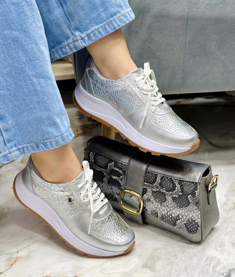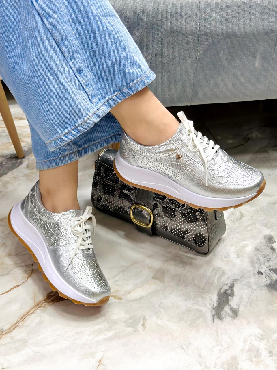 Tenis en cuero color Plateado, con un diseño que combina cuero liso y cuero grabado tipo Baltimore, aportando textura y un estilo sofisticado. Su interior cuenta con abullonado en material sintético que brinda mayor comodidad en cada paso. Ideales para quienes buscan destacar con elegancia y originalidad.