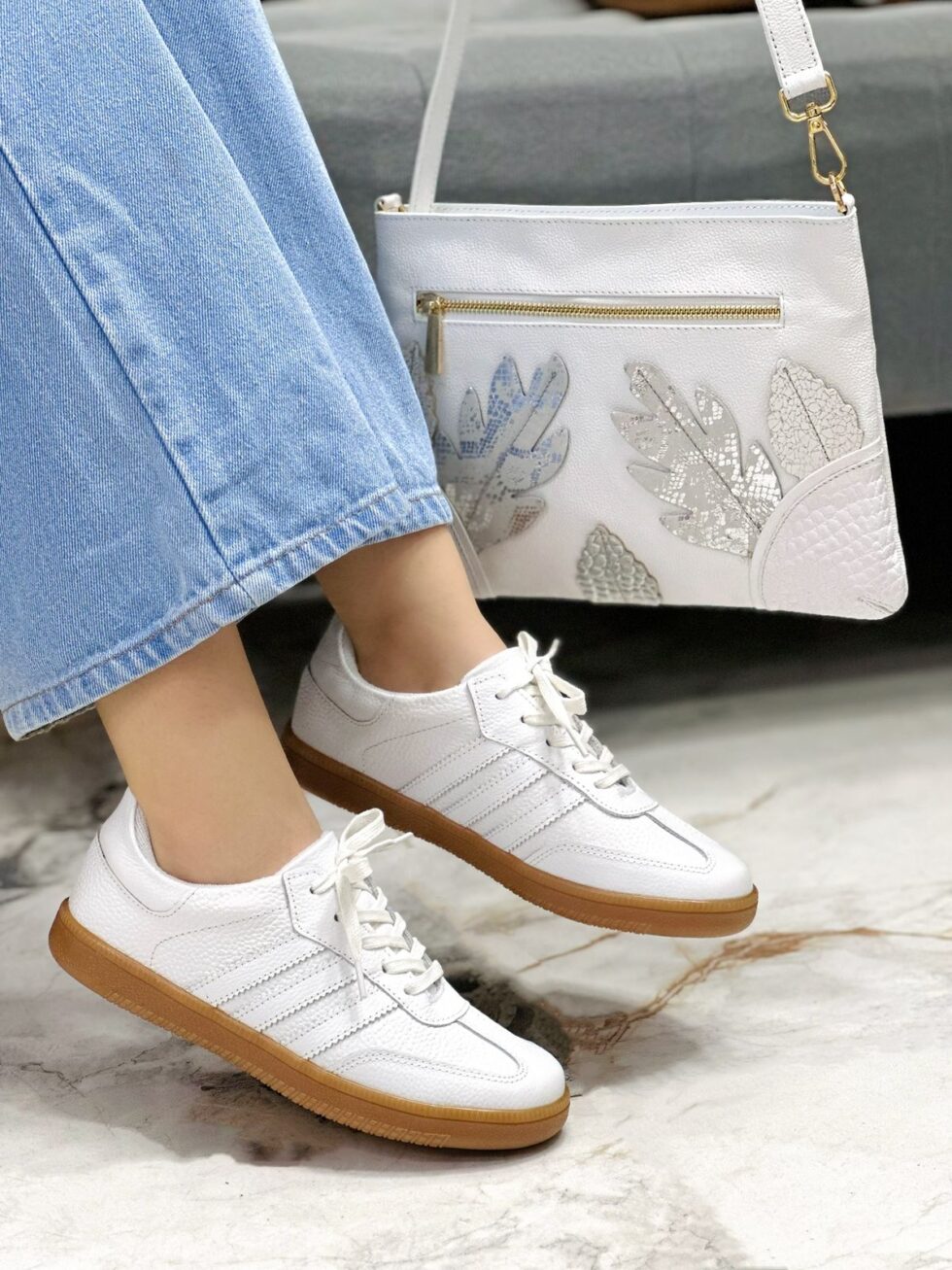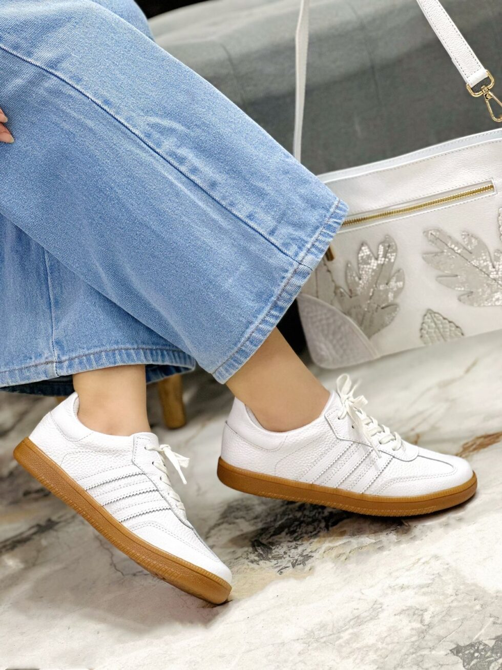 Estos tenis en cuero color blanco son el equilibrio perfecto entre estilo y comodidad. Su diseño clásico destaca por la suela bajita en tono café, que les aporta un toque moderno y versátil, ideal para combinar con cualquier look. Fabricados en cuero de alta calidad, garantizan durabilidad y un calce cómodo para uso diario. Perfectos para quienes buscan un estilo casual, elegante y atemporal.