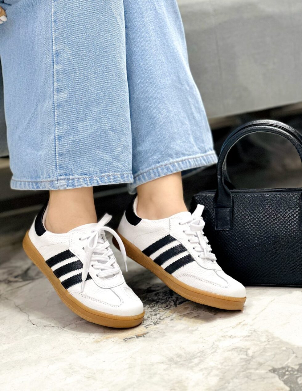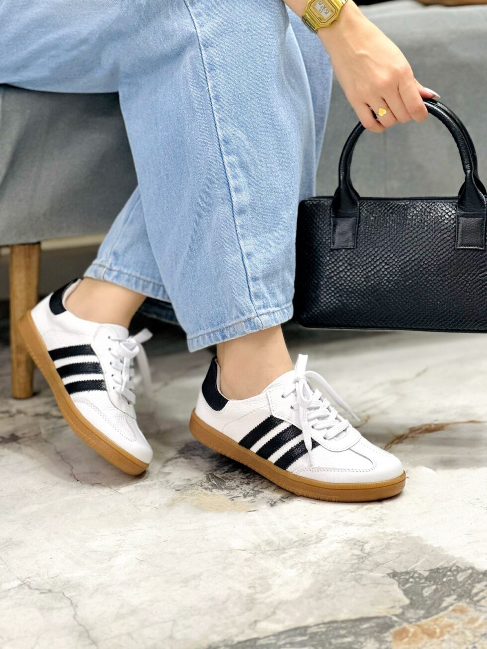 Estos tenis en cuero color Blanco combinado con líneas Negras son el equilibrio perfecto entre estilo y comodidad. Su diseño clásico destaca por la suela bajita en tono café, que les aporta un toque moderno y versátil, ideal para combinar con cualquier look. Fabricados en cuero de alta calidad, garantizan durabilidad y un calce cómodo para uso diario. Perfectos para quienes buscan un estilo casual, elegante y atemporal.