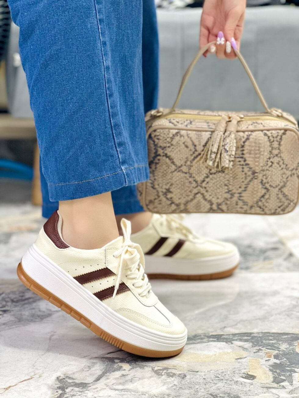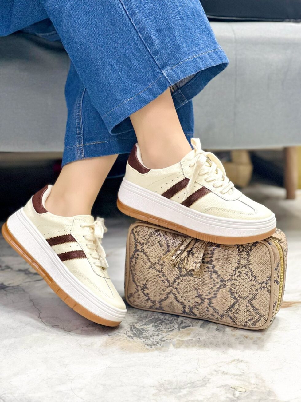 Estos tenis están fabricados en cuero Talco y cuentan con detalles en avellana que les dan un toque único y sofisticado. Su suela talco con base caramelo aporta estilo y estabilidad, mientras que el interior acolchado garantiza máxima comodidad en cada paso.