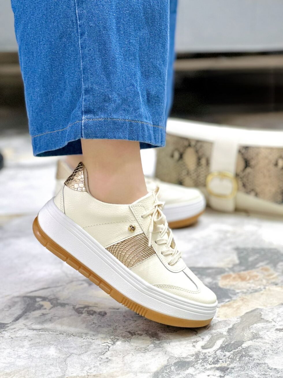La suela blanca con base en tono caramelo brinda un look actual y versátil, además de ofrecer excelente soporte y comodidad para el día a día.