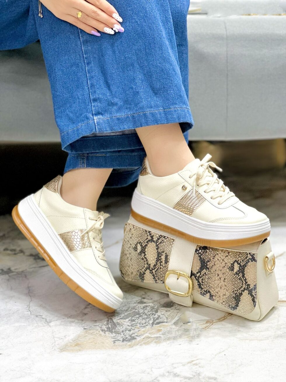 Sus piezas en color dorado aportan un toque sofisticado y moderno que eleva cualquier outfit, mientras que los cordones en tono claro crean un contraste delicado y armonioso.