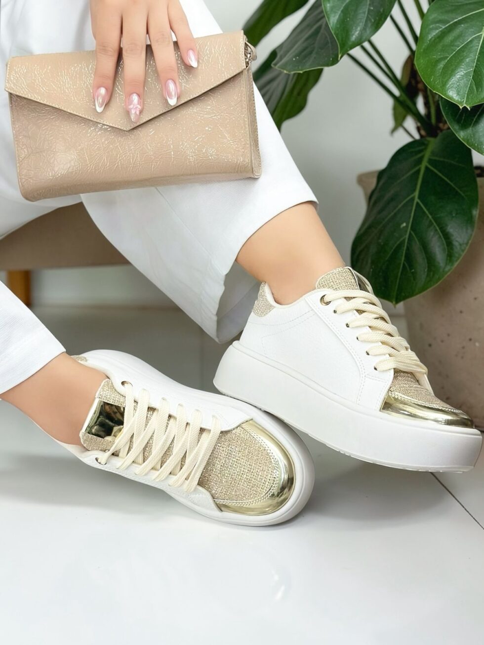 Tenis para mujer en material sintético, diseñados en elegante color Talco con detalles dorado que aportan un toque moderno y sofisticado. ✨