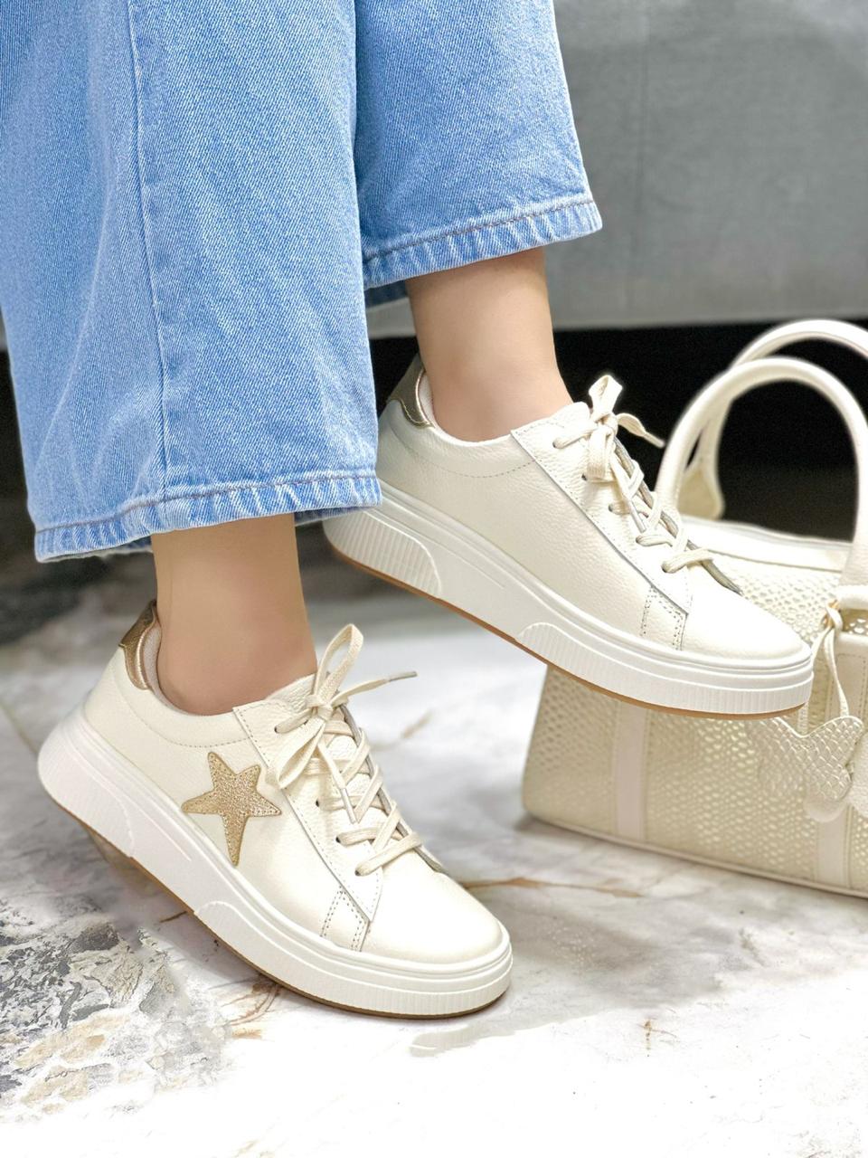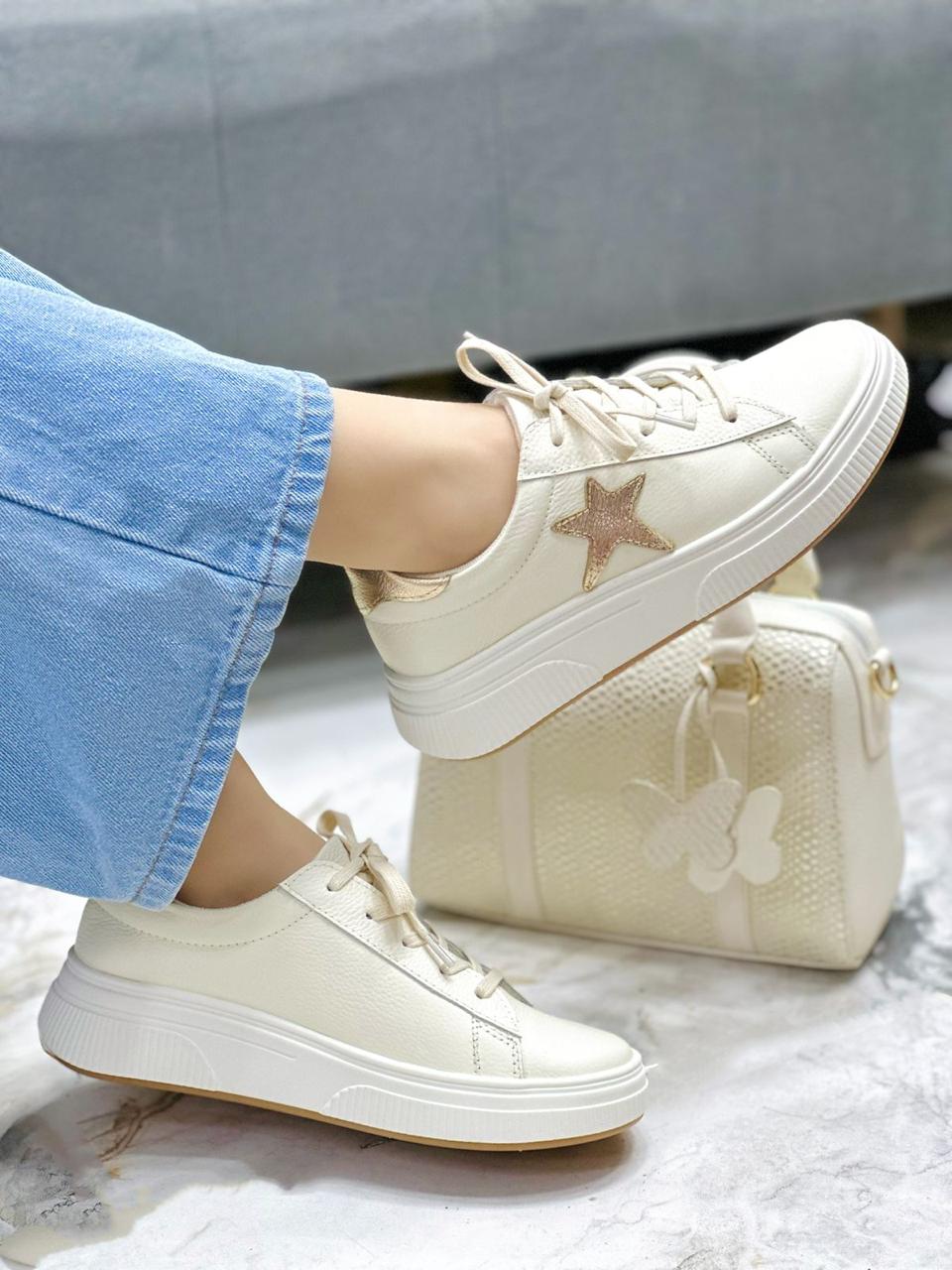 Estos tenis en cuero color Talco son el equilibrio perfecto entre estilo y comodidad. Su diseño se realza con elegantes detalles en color dorado, que aportan un toque moderno y sofisticado, ideal para elevar cualquier outfit casual. Cuentan con una suela talco que brinda una pisada estable y cómoda, perfecta para el uso diario. Son versátiles, fáciles de combinar y pensados para quienes buscan un calzado práctico sin perder el estilo.