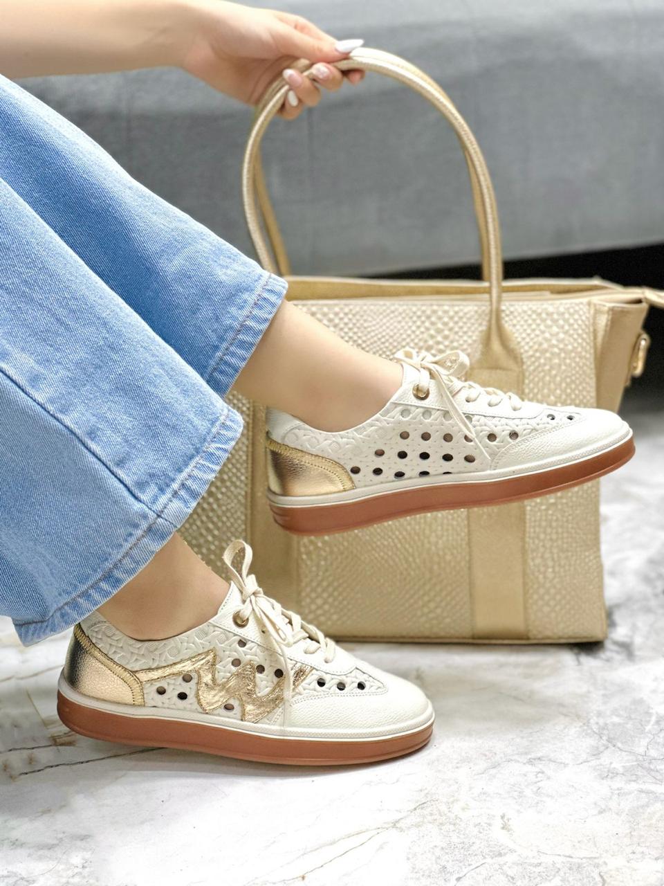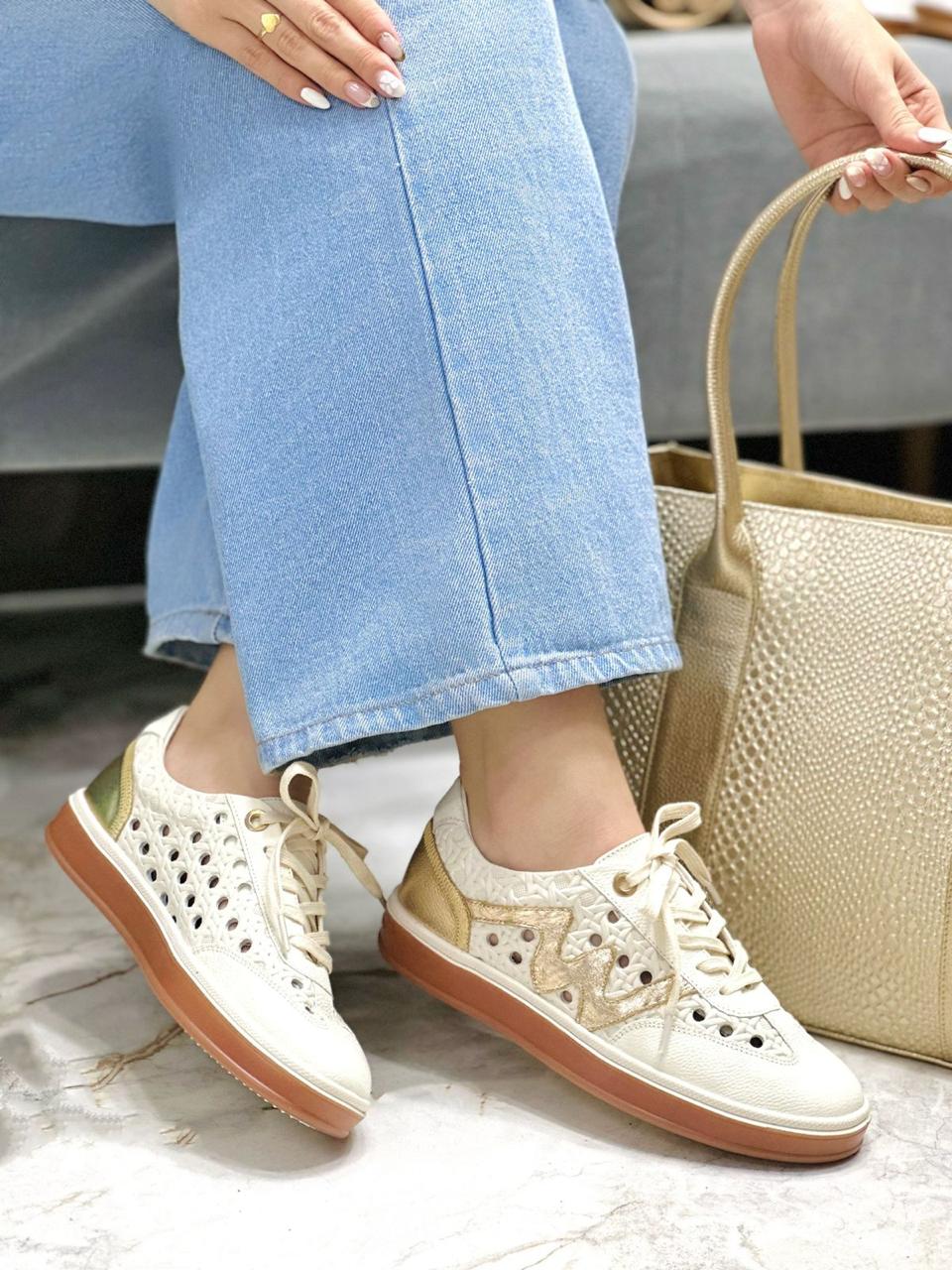 Tenis elaborados en cuero color talco, combinados con detalles laterales en tono dorado que aportan un acabado moderno y elegante. Su diseño con cortes calados ofrece frescura y estilo, mientras que la suela en contraste brinda comodidad y estabilidad en cada paso. Un calzado versátil, ligero y perfecto para complementar looks casuales con un toque sofisticado..