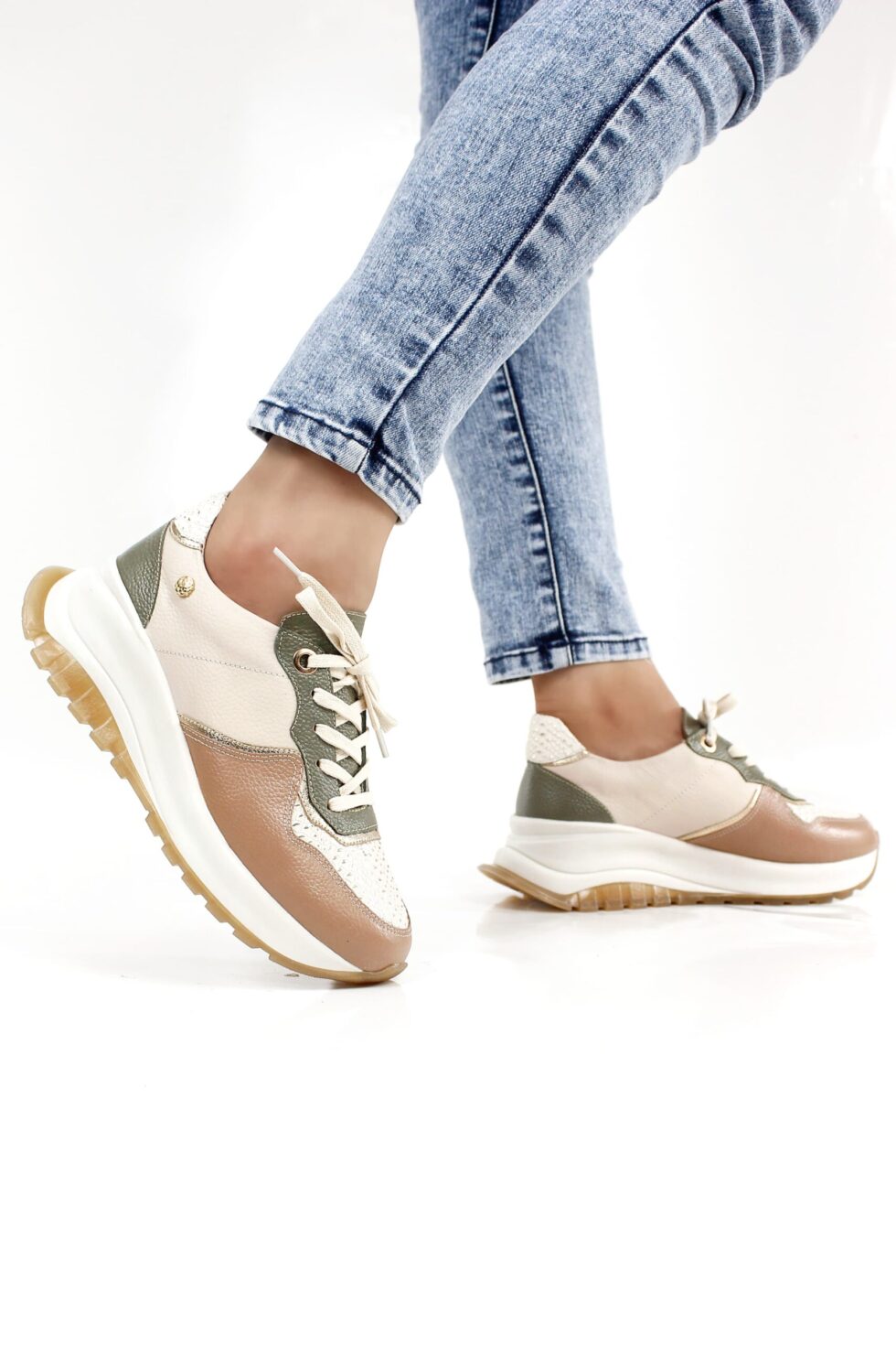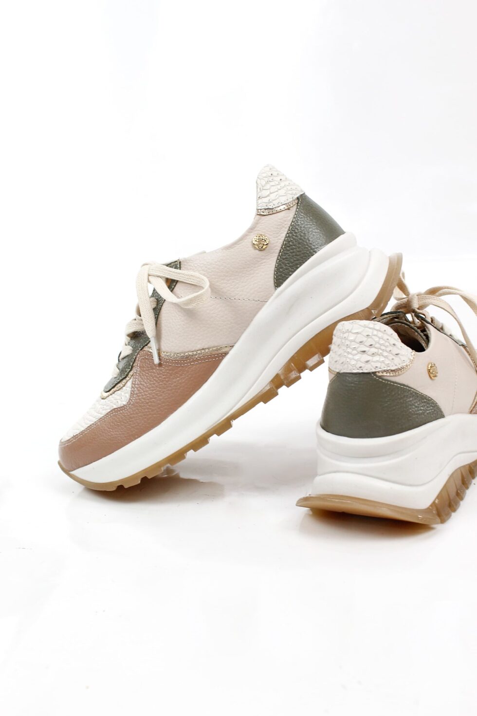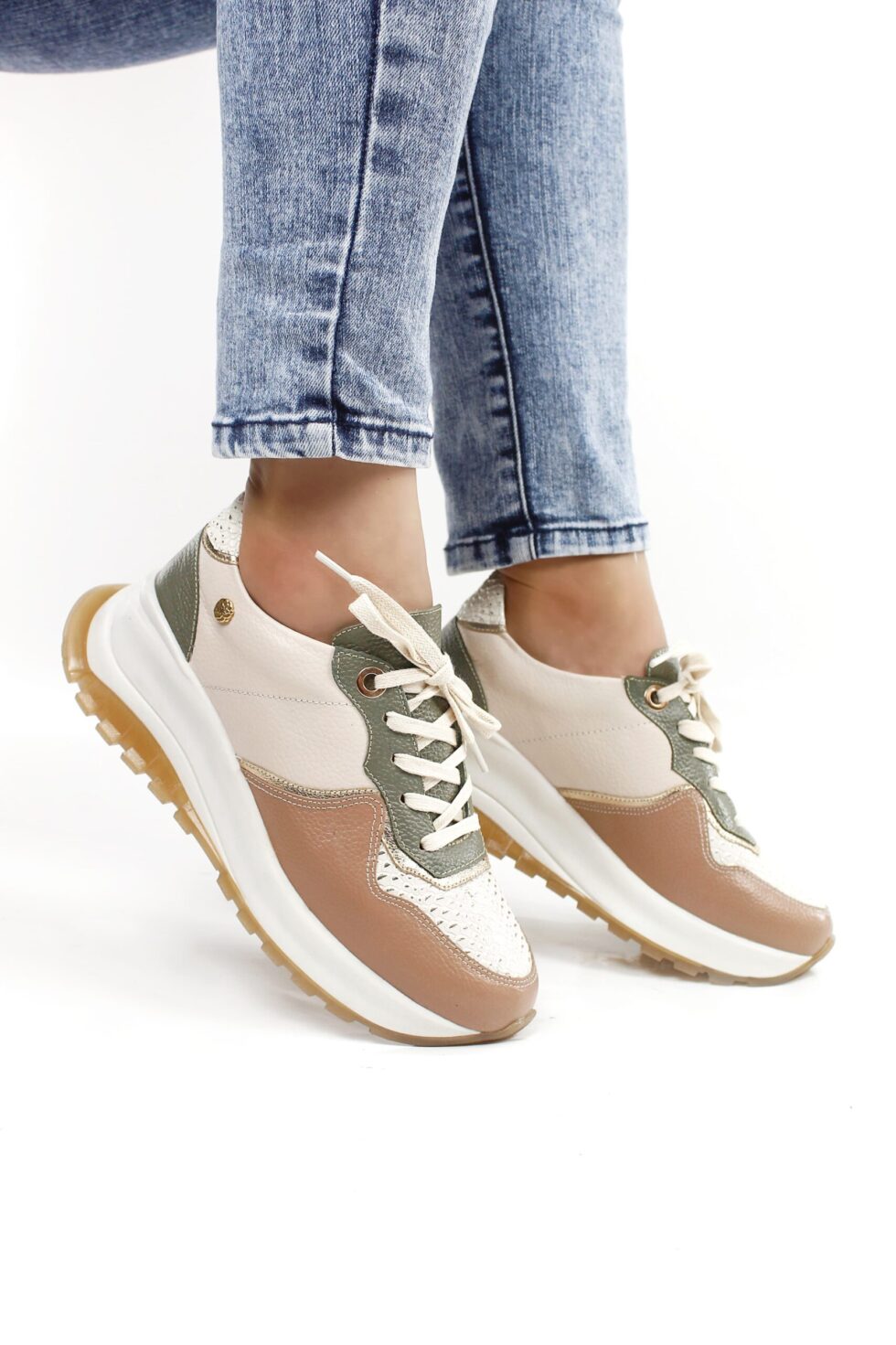 Tenis de cuero en color talco, complementados armoniosamente con elegantes detalles en café y verde, ideales para quienes buscan estilo y comodidad en cada paso. Elaborados en cuero de alta calidad, cuentan con plantilla confort y abullonado en material sintético para un ajuste suave y cómodo. Su diseño se completa con una hermosa folia de visos plateados que aporta un toque moderno y sofisticado, convirtiéndolos en el complemento perfecto para cualquier atuendo casual o urbano.