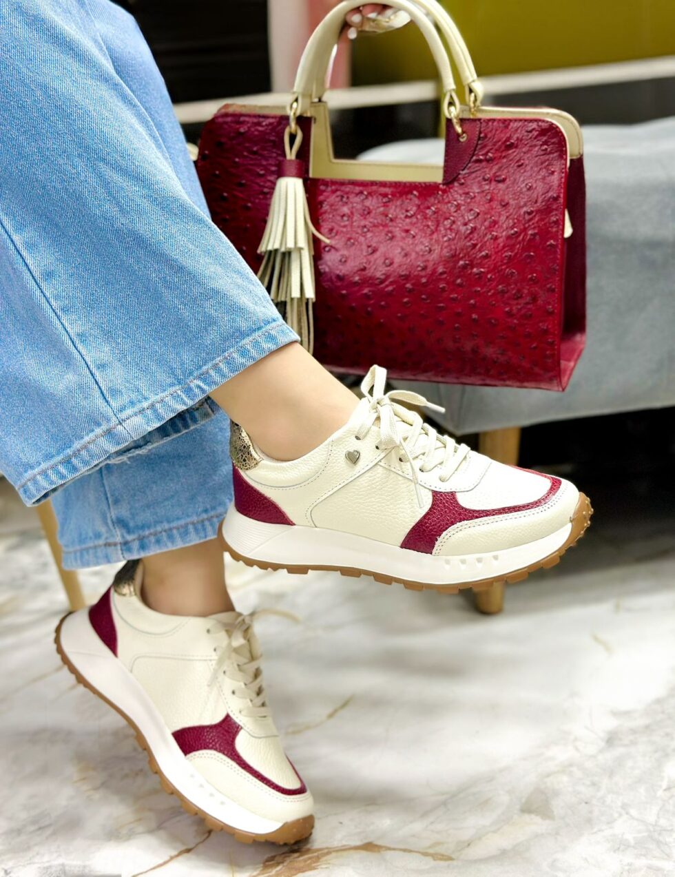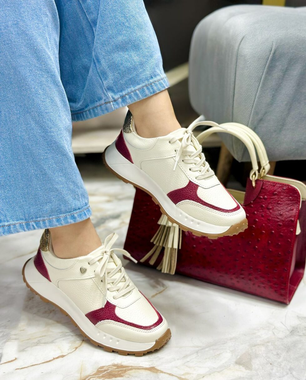 Estos tenis en cuero color talco combinan a la perfección con piezas en tono vinotinto y detalles dorados que añaden un toque de sofisticación y modernidad. Su diseño destaca por la armonía entre elegancia y comodidad, ideal para quienes buscan estilo sin sacrificar bienestar. Fabricados en cuero de alta calidad, ofrecen una textura suave y resistente, mientras que su suela liviana proporciona una pisada cómoda y estable. Perfectos para cualquier ocasión, estos tenis elevan cualquier look con un aire refinado y contemporáneo.