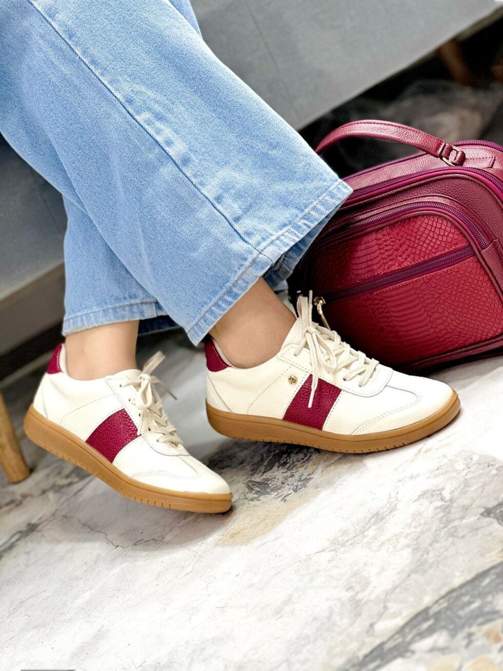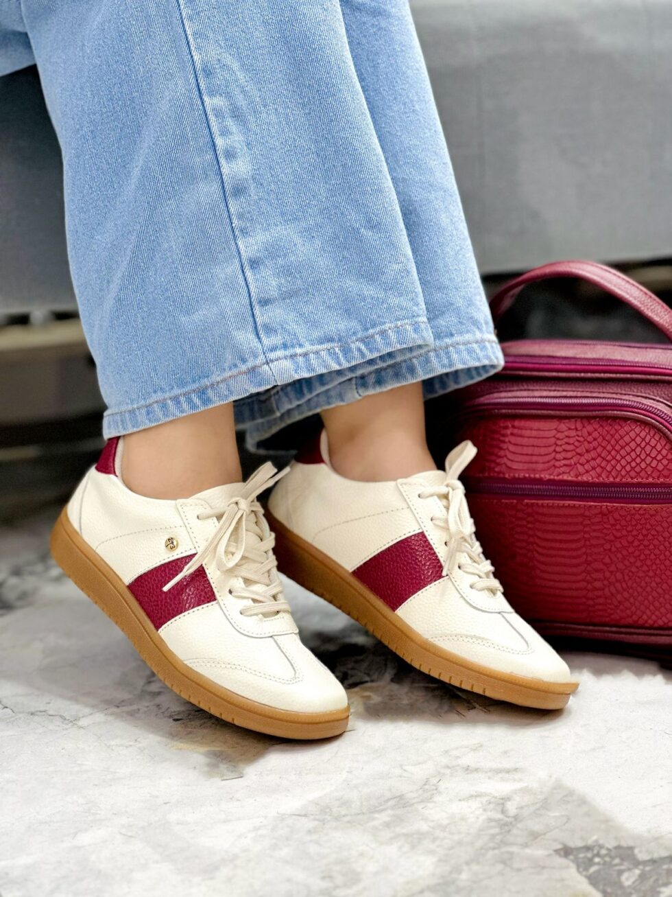 Tenis elaborados en cuero en tono talco, combinados con franjas laterales en color Vinotinto que realzan su diseño minimalista y moderno. Su suela baja en tono caramelo los hace ligeros y perfectos para el uso diario. En el interior cuentan con abullonado en forro textil que brinda mayor comodidad y suavidad en cada paso.
