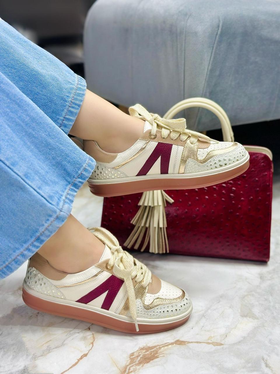 Los tenis en color talco son la combinación perfecta entre elegancia y confort. Su diseño único destaca por una base en tono neutro que se realza con una delicada folia dorada y piezas en color vinotinto, creando un contraste moderno y sofisticado. Fabricados con materiales de alta calidad, ofrecen suavidad, ligereza y un ajuste ideal para el día a día. Perfectos para quienes buscan un calzado versátil que combine con cualquier look, desde outfits casuales hasta más chic.