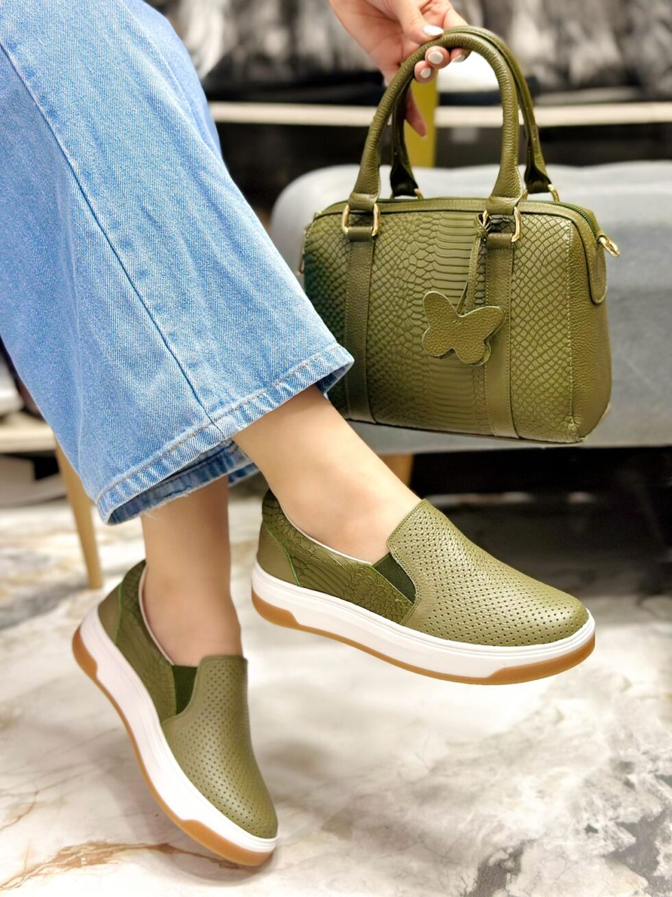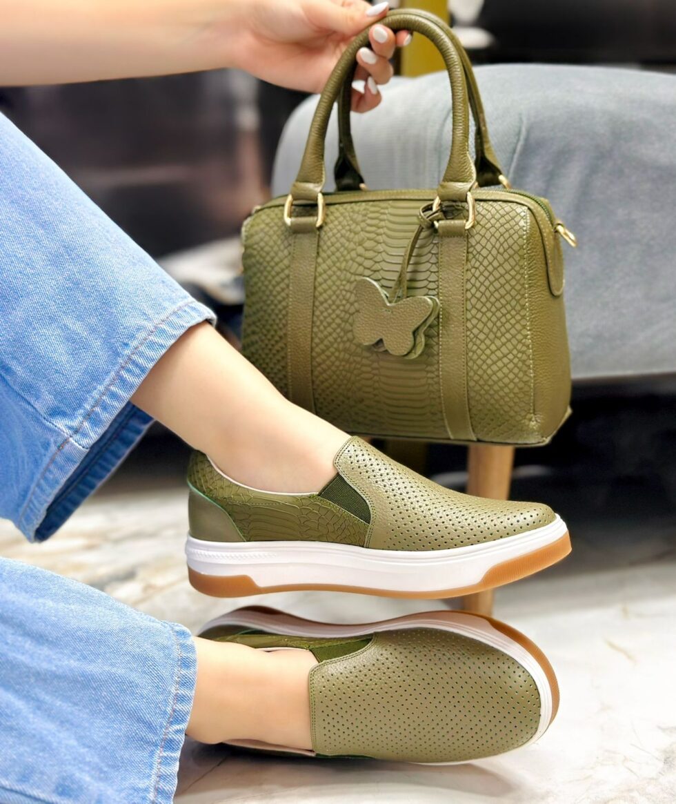 Tenis en color Verde diseñados sin cordones para facilitar su postura y ofrecer máxima practicidad. Cuentan con pequeños resortes a ambos lados que permiten un ajuste cómodo y seguro al pie. Están elaborados en cuero de alta calidad, y en su interior incorporan un suave abullonado que proporciona una sensación de confort superior, ideal para el uso diario con estilo y comodidad.