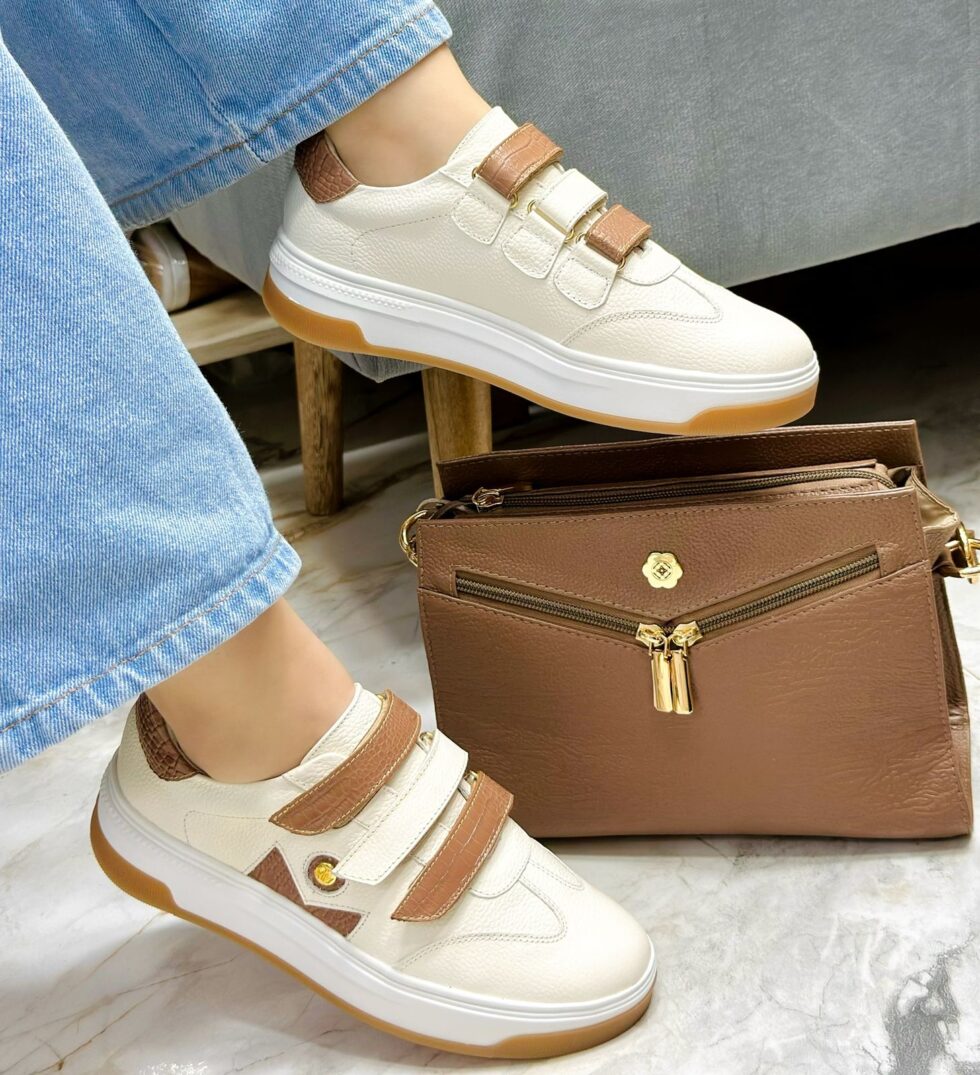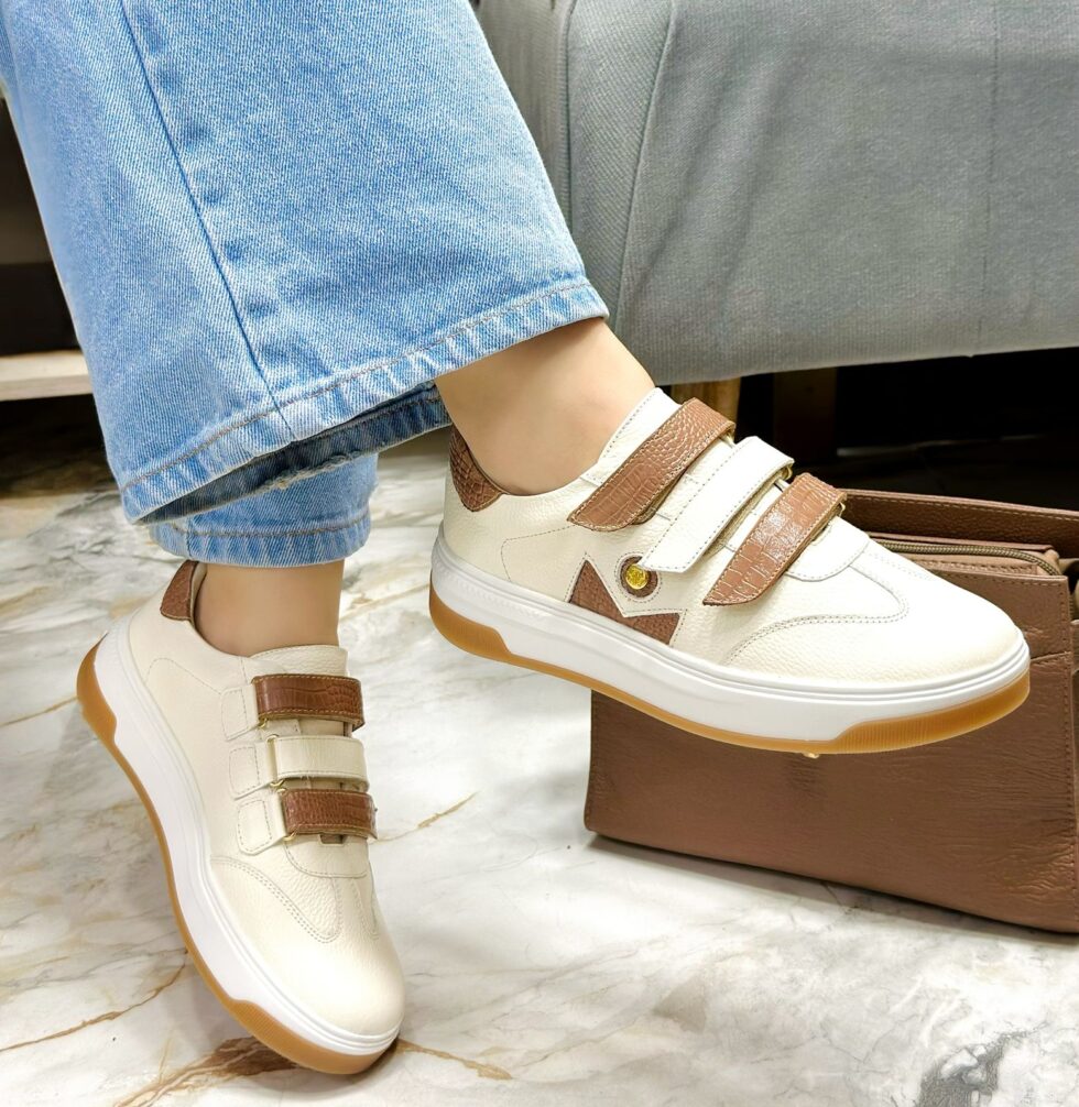 Tenis en color Talco combinado con avellana, diseñados sin cordones para facilitar su postura y ofrecer máxima practicidad ya que cuenta con ajuste en velcro en la parte de arriba los cuales permiten un ajuste cómodo y seguro al pie. Están elaborados en cuero de alta calidad, y en su interior incorporan un suave abullonado en material sintético que proporciona una sensación de confort superior, ideal para el uso diario con estilo y comodidad.