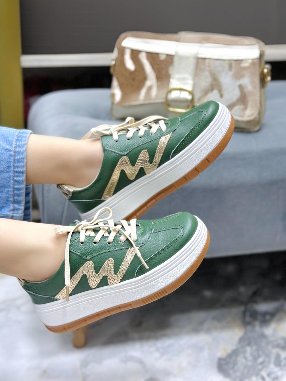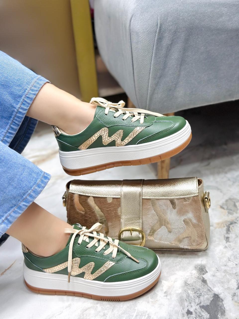 Estos tenis en cuero color Verde, complementados con detalles a ambos lados con un cuero grabado en tono dorado, son la elección perfecta para un estilo sofisticado y versátil. El tono Verde domina el diseño, mientras que las líneas aportan un contraste elegante y moderno. Su interior acolchado en material sintético asegura comodidad total para llevarlos durante todo el día, brindando suavidad y soporte. Un modelo ideal para quienes buscan un equilibrio entre estilo y confort en un calzado atemporal