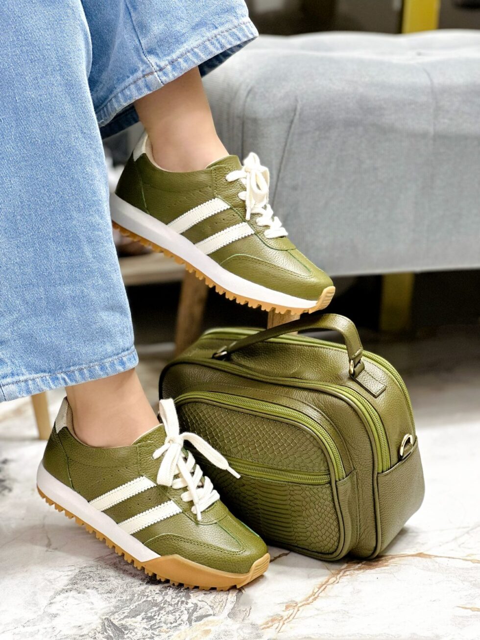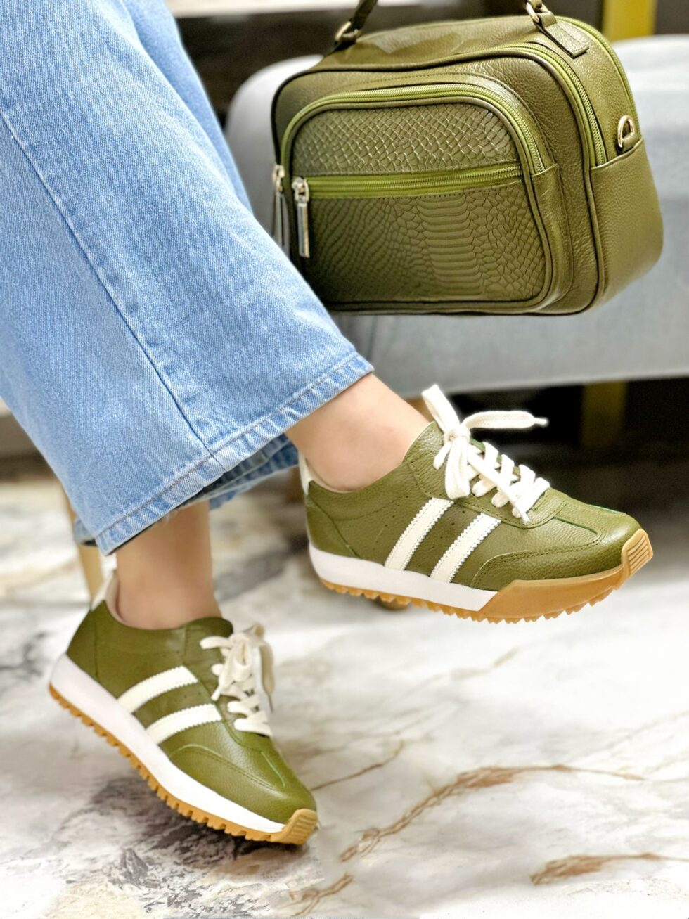 Tenis en cuero de alta calidad en su color Verde con franjas en color talco, creando un diseño moderno y versátil. Su estilo deportivo se realza con detalles en cuero liso y texturizado, además de una suela dentada que ofrece excelente tracción y confort en cada paso. Con cordones para un ajuste perfecto y plantilla acolchada, son ideales para looks casuales que buscan comodidad y estilo durante todo el día.
