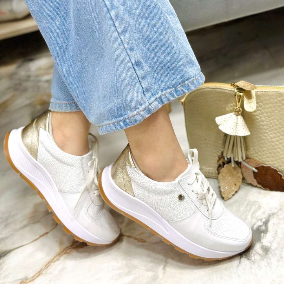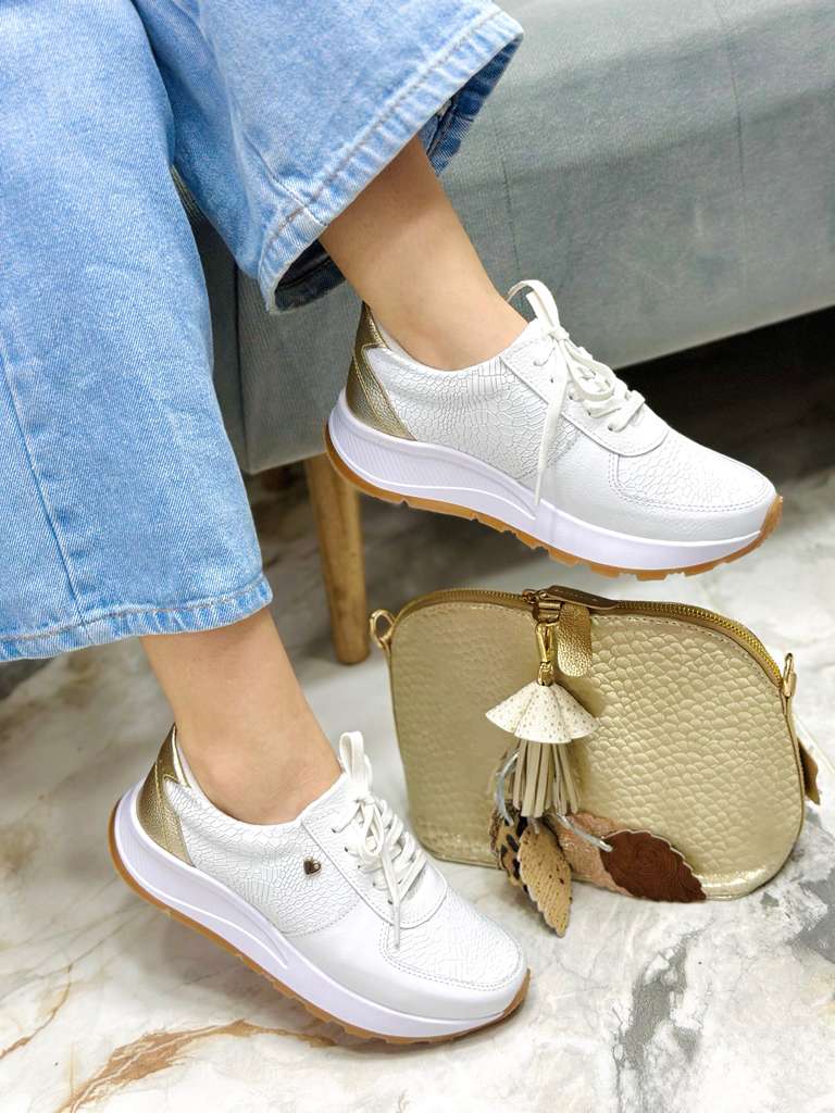 Tenis en cuero color Blanco combinado por Dorado , con un diseño que combina cuero liso y cuero grabado tipo baltimore, aportando textura y un estilo sofisticado. Su interior cuenta con abullonado en material sintético que brinda mayor comodidad en cada paso. Ideales para quienes buscan destacar con elegancia y originalidad.