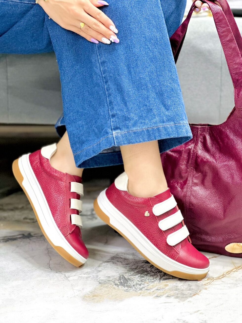 Los tenis combinan practicidad y estilo en un diseño moderno y versátil. Fabricados 100% en cuero, ofrecen durabilidad y un acabado sofisticado. Su sistema de cierre en velcro permite una postura fácil y rápida, brindando comodidad en cada uso. En color vinotinto combinado con talco, se convierten en un básico infaltable que complementa cualquier look con un toque limpio y elegante.