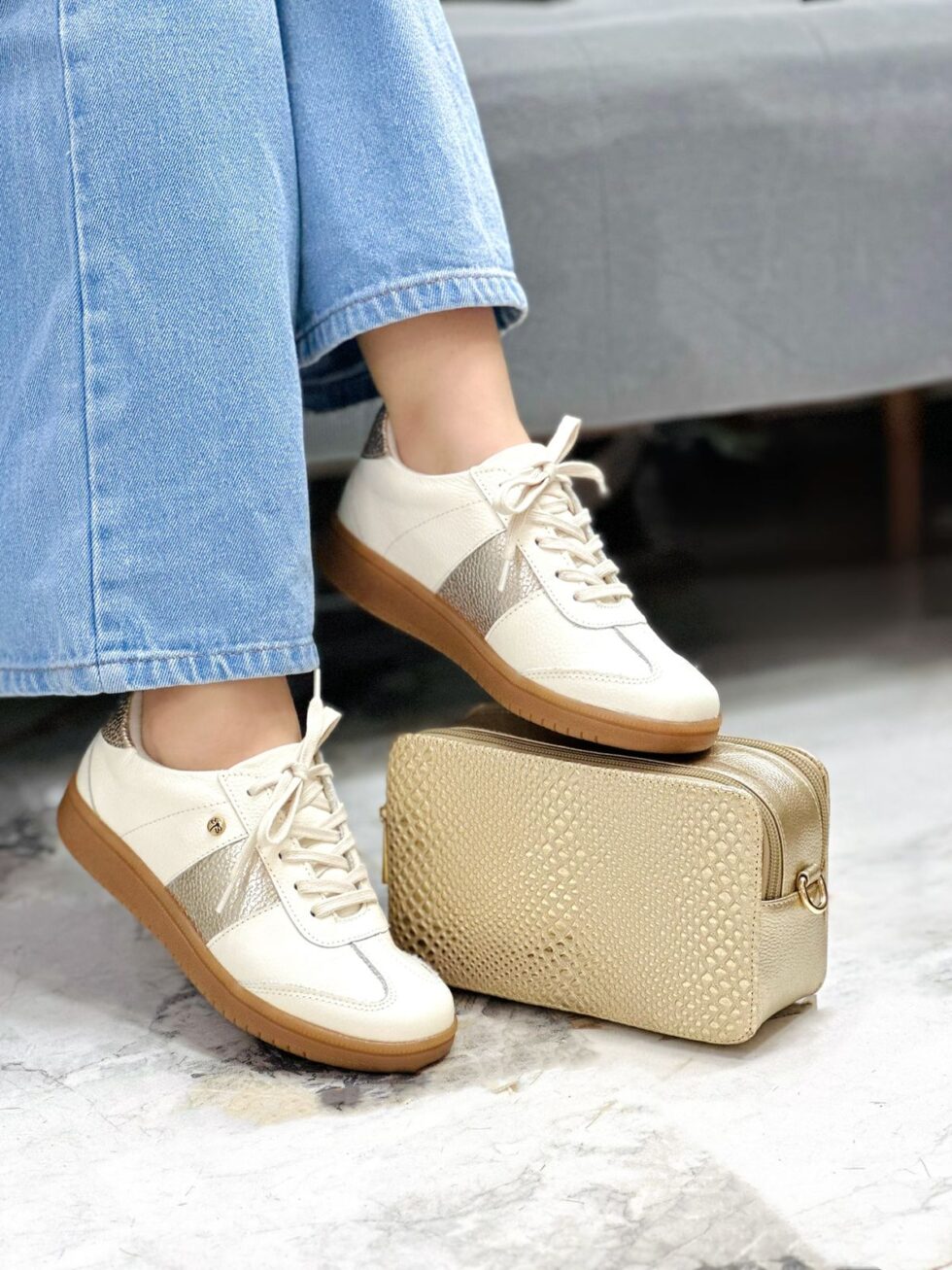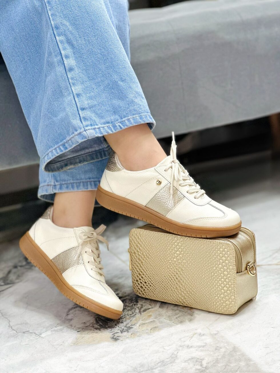 Tenis elaborados en cuero en tono talco, combinados con franjas laterales en color dorado que realzan su diseño minimalista y moderno. Su suela baja en tono caramelo los hace ligeros y perfectos para el uso diario. En el interior cuentan con abullonado en forro textil que brinda mayor comodidad y suavidad en cada paso.